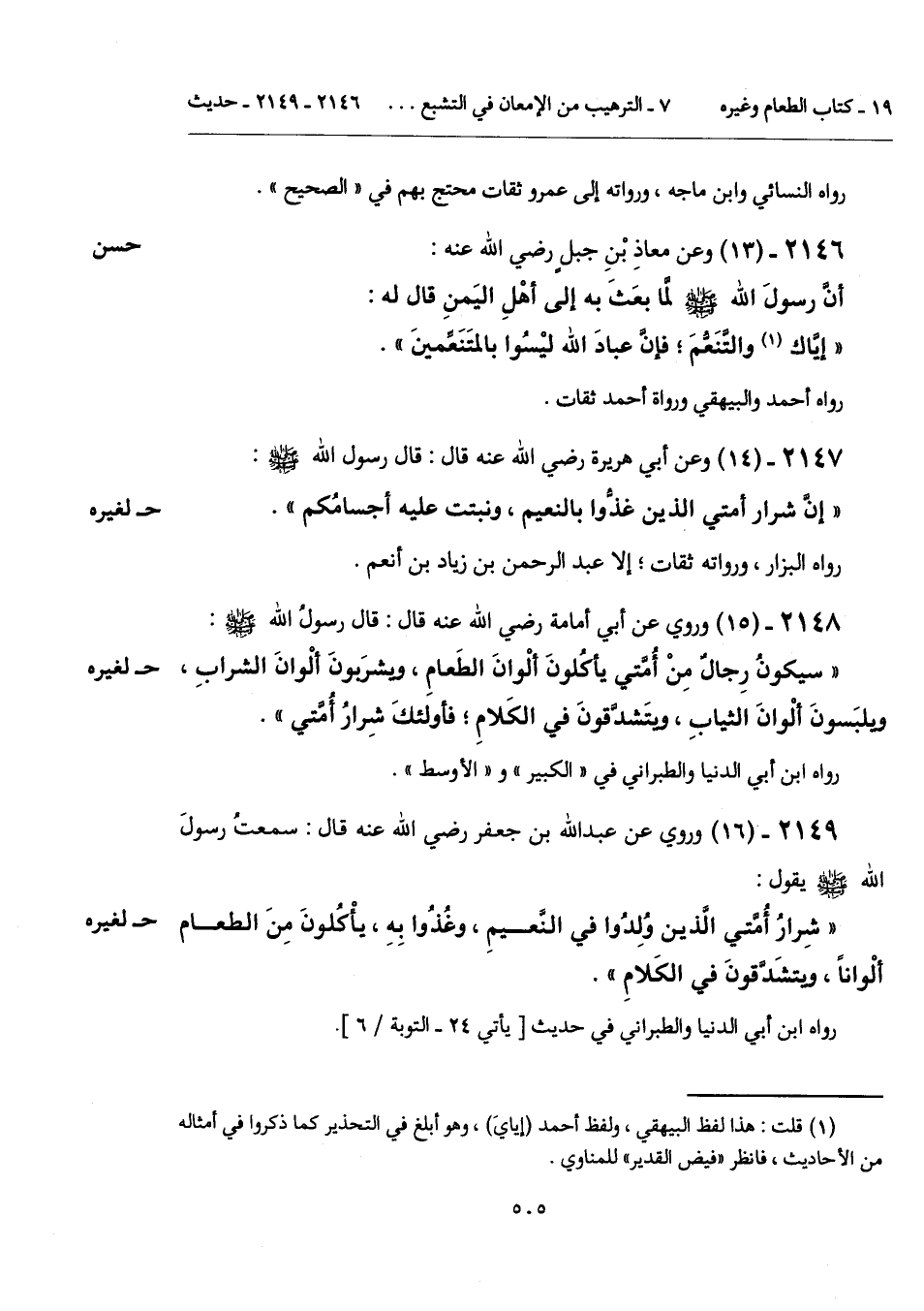 "شِرارُ أُمَّتي الَّذين وُلِدُوا في النَّعيمِ، وغُذُوا بِهِ، يأْكُلونَ مِنَ الطعام ألْواناً، ويتشَدَّقونَ في الكَلامِ".