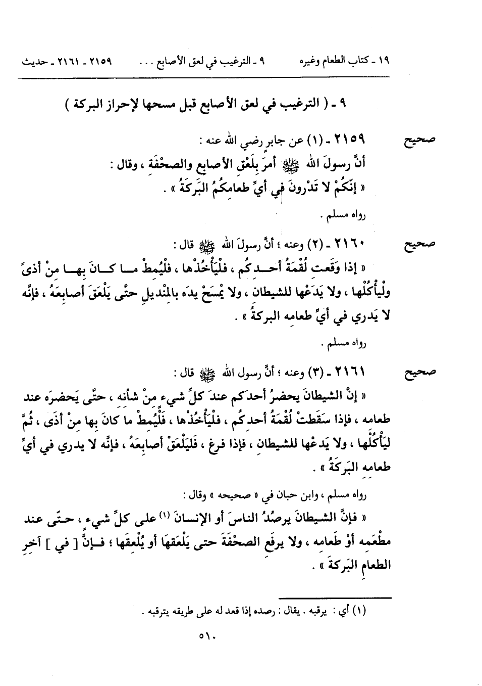 9 - (الترغيب في لعق الأصابع قبل مسحها لإحراز البركة).