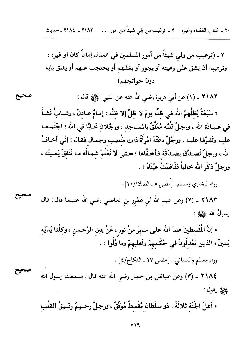 2 - (ترغيب من ولي شيئاً من أمور المسلمين في العدل إماماً كان أو غيره، وترهيبه أن يشق على رعيته أو يجور أو يغشهم أو يحتجب عنهم أو يغلق بابه دون حوائجهم).