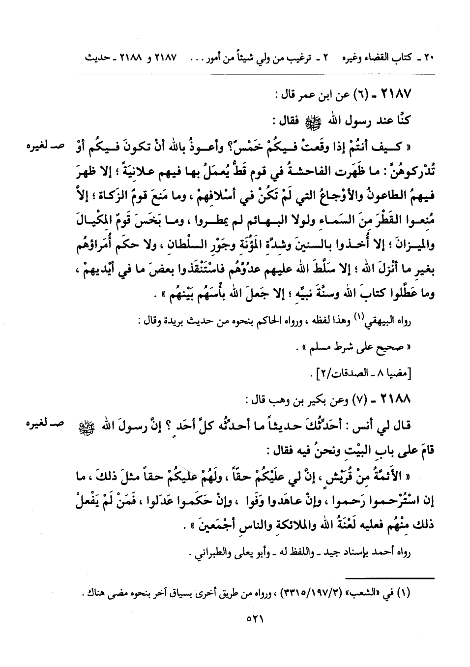 "الأَئمَّةُ مِنْ قُرَيْشٍ، إنَّ لي علَيْكُمْ حقّاً، ولَهُمْ عليكُمْ حقاً مثلَ ذلكَ، ما إن اسْتُرْحموا رَحموا، وإنْ عاهَدوا وَفَوا، وإنْ حَكَموا عَدَلوا، فَمَنْ لَمْ يَفْعلْ ذلك مِنْهُم فعليه لَعْنَةُ الله والملائكةِ والناسِ أجْمَعينَ".