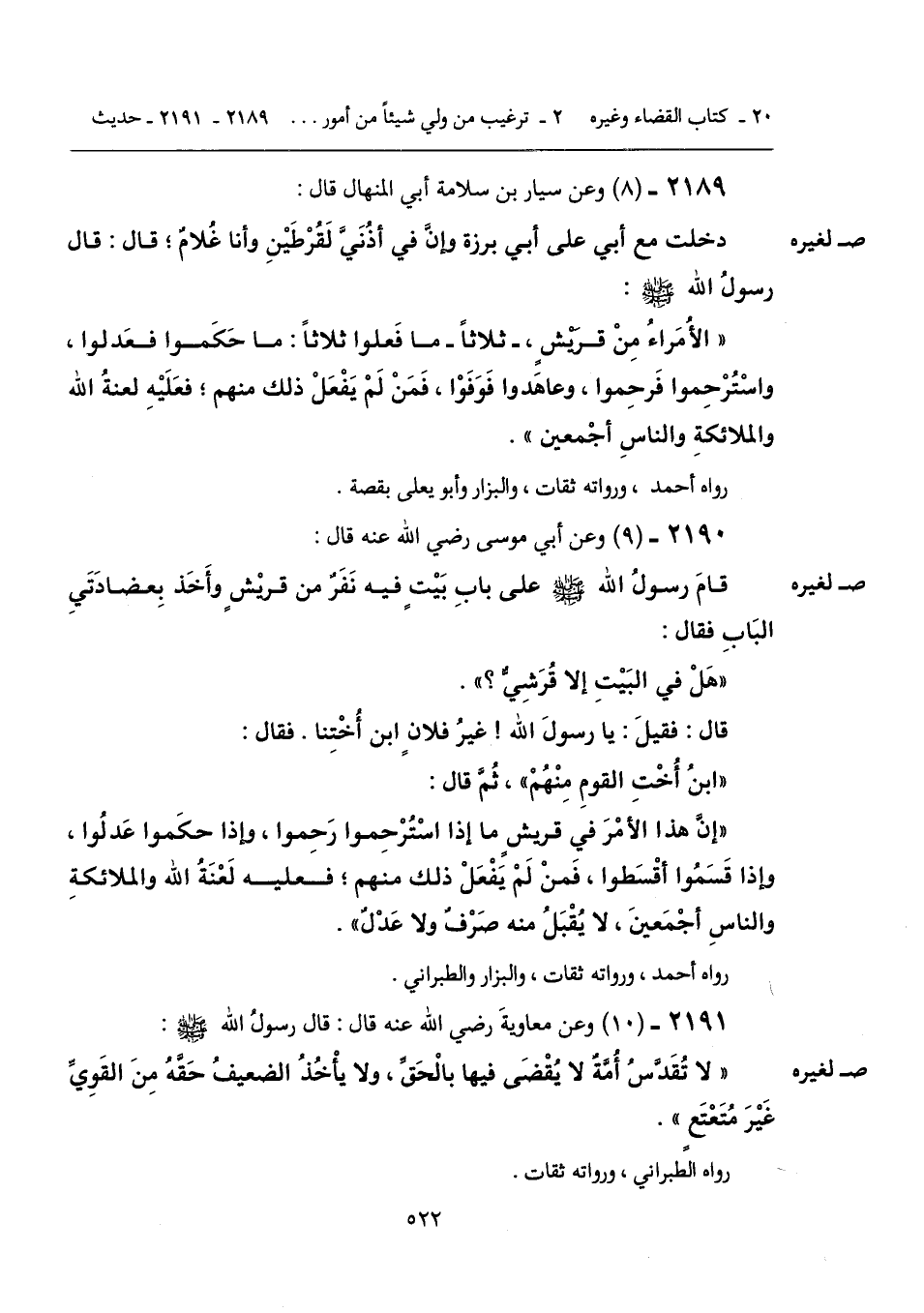"الأمَراءُ مِنْ قرَيْشٍ، -ثلاثاً- ما فَعلوا ثلاثاً: ما حَكَموا فعَدلوا، واسْتُرْحِموا فَرحِموا، وعاهَدوا فَوَفَوْا، فَمَنْ لَمْ يَفْعَلْ ذلك منهم؛ فعَلَيْهِ لعنةُ الله والملائكةِ والناسِ أجْمعين".