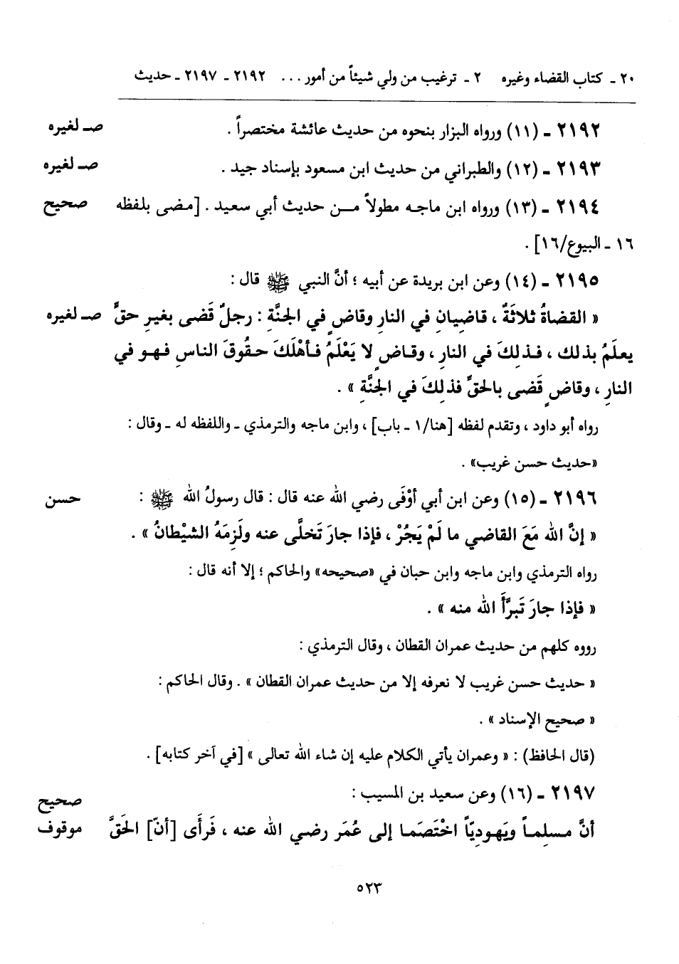 "القضاةُ ثلاثَة، قاضِيانِ في النارِ وقاضٍ في الجنَّةِ: رجلٌ قَضى بغيرِ حقٍّ يعلَمُ، بذلك، فذلِكَ في النارِ، وقاضٍ لا يَعْلَمُ فأهْلَكَ حقُوقَ الناسِ فهو في النارِ، وقاضٍ قَضى بالحقِّ فذلِكَ في الجنَّةِ".