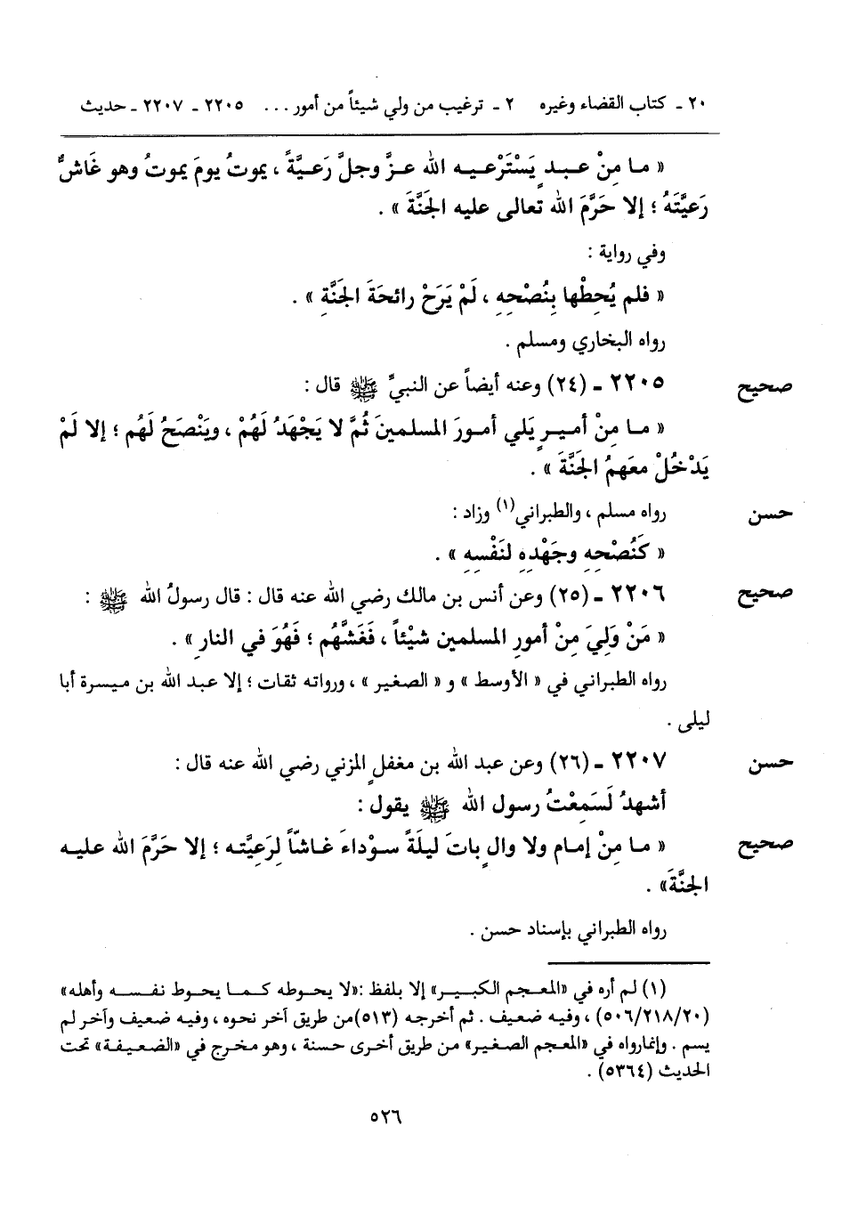 "ما مِنْ عبدٍ يَسْتَرْعيه الله عزَّ وجلَّ رَعيَّةً، يموتُ يومَ يموتُ وهو غَاشٌّ رَعيَّتَهُ؛ إلا حَرَّمَ الله تُعالى عليه الجَنَّةَ".
