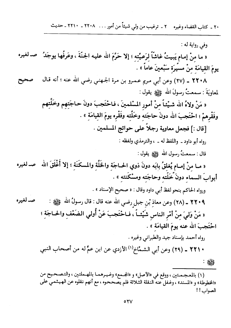"مَنْ ولاهُ الله شيْئاً مِنْ أمورِ المسْلمينَ، فاحْتَجبَ دونَ حاجَتِهِم وخَلَّتِهم وفَقْرِهمْ؛ احْتَجبَ الله دونَ حاجَتهِ وخَلَّتِه وفَقْرِه يومَ القِيامَةِ".