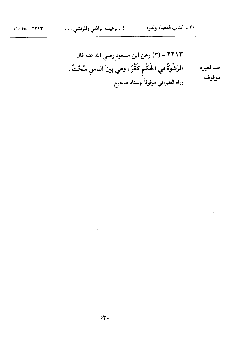 الرِّشْوَةُ في الحُكْمِ كُفْرٌ، وهي بينَ الناسِ سُحْتٌ.