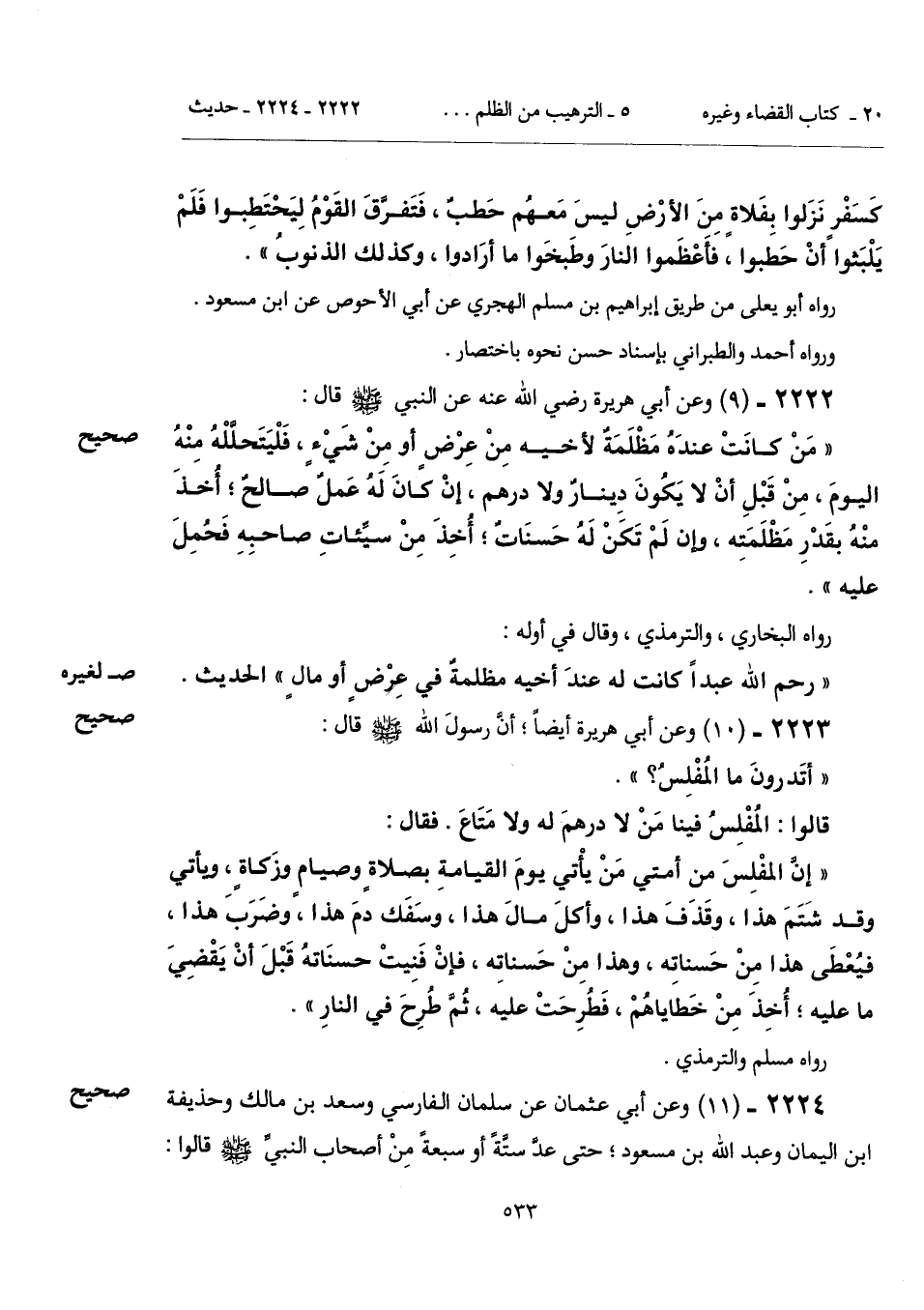 "إنَّ المفْلِسَ من أمتي مَنْ يأتي يومَ القيامةِ بصلاةٍ وصيام وزَكاةٍ، ويأتي وقد شَتَمَ هذا، وقَذَفَ هذا، وأكلَ مالَ هذا، وسَفَك دمَ هذا، وضَرَبَ هذا، فيُعْطَى هذا مِنْ حَسناتِه، وهذا مِنْ حَسناتِه، فإنْ فَنِيتْ حسنَاتهُ قَبْلَ أنْ يَقْضِيَ ما عليه؛ أخذَ مِنْ خَطاياهُمْ، فَطرِحَتْ عليه، ثمَّ طرِحَ في النارِ".