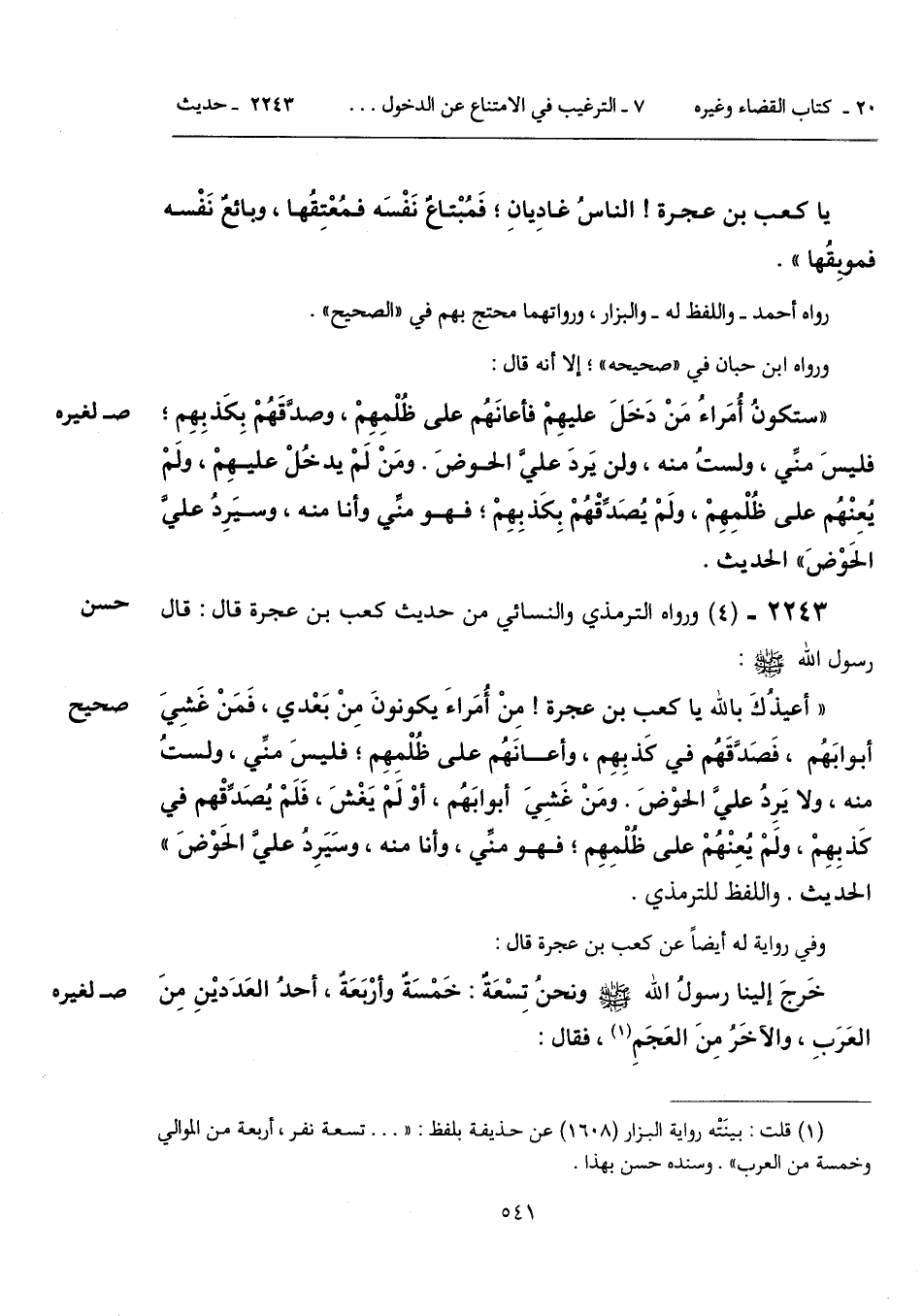 "أعيذُكَ بالله يا كعب بن عجرة! مِنْ أمَراءَ يكونونَ مِنْ بَعْدي، فَمَنْ غَشِيَ أبوابَهُم، فَصَدَّقَهُم في كَذبِهِم، وأعانَهُم على ظُلْمِهِم؛ فليسَ منِّي، ولستُ منه، ولا يَرِدُ عليَّ الحوْضَ. ومَنْ غَشِيَ أبوابَهُم، أوْ لَمْ يَغْشَ، فَلَمْ يُصَدِّقْهم في كذبِهِمْ، ولَمْ يُعِنْهُمْ على ظُلْمِهِم؛ فهو منِّي، وأنا منه، وسَيَرِدُ عليَّ الحَوْضَ" الحديث. واللفظ للترمذي.
