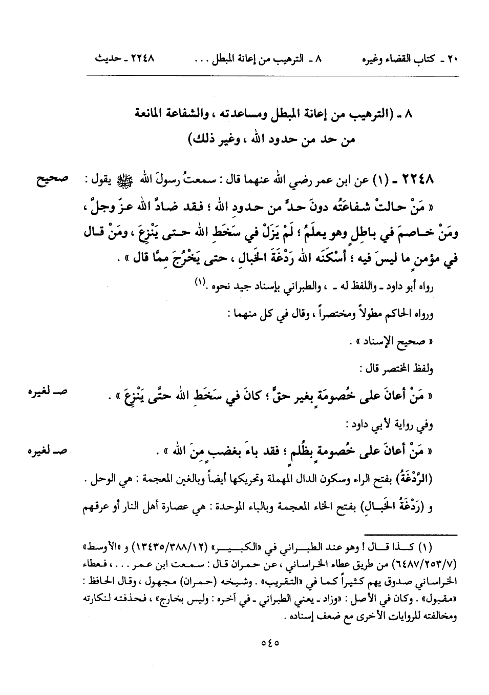 "مَنْ حالتْ شفاعَتُه دونَ حدٍّ من حدودِ الله، فقد ضادَّ الله عزَّ وجلَّ، ومَنْ خاصمَ في باطِلٍ وهو يعلَمُ؛ لَمْ يَزَلْ في سَخَطِ الله حتى يَنْزِعَ، ومَنْ قال في مؤمنٍ ما ليسَ فيه؛ أسْكَنَه الله رَدْغَةَ الخَبالِ، حتى يَخْرُجَ مِمَّا قال".