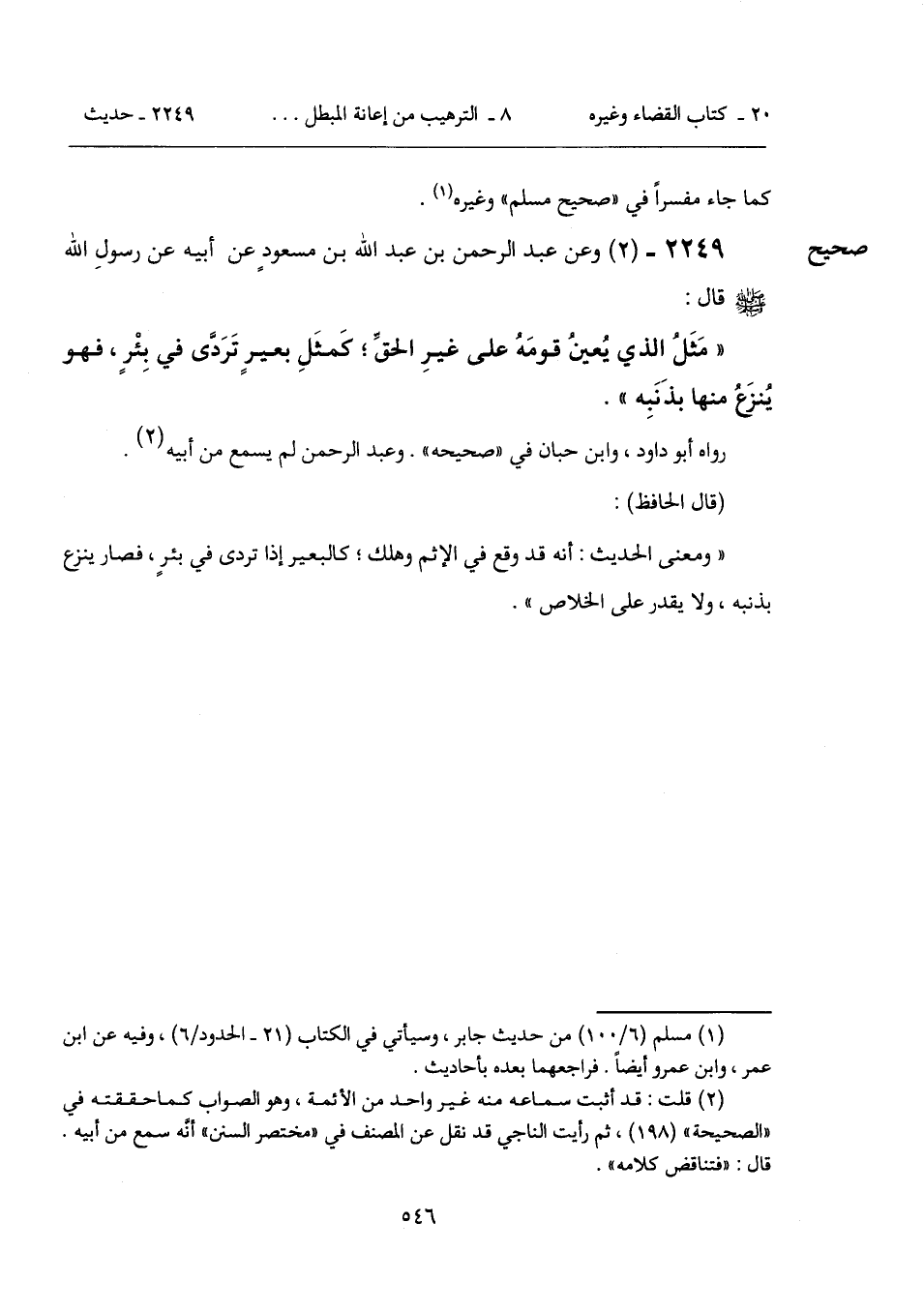 "مَثَلُ الذي يُعينُ قومَهُ على غيرِ الحقِّ؛ كَمثَلِ بعيرٍ تَرَدَّى في بِئْرٍ، فهو يُنزَعُ منها بذَنَبِه".