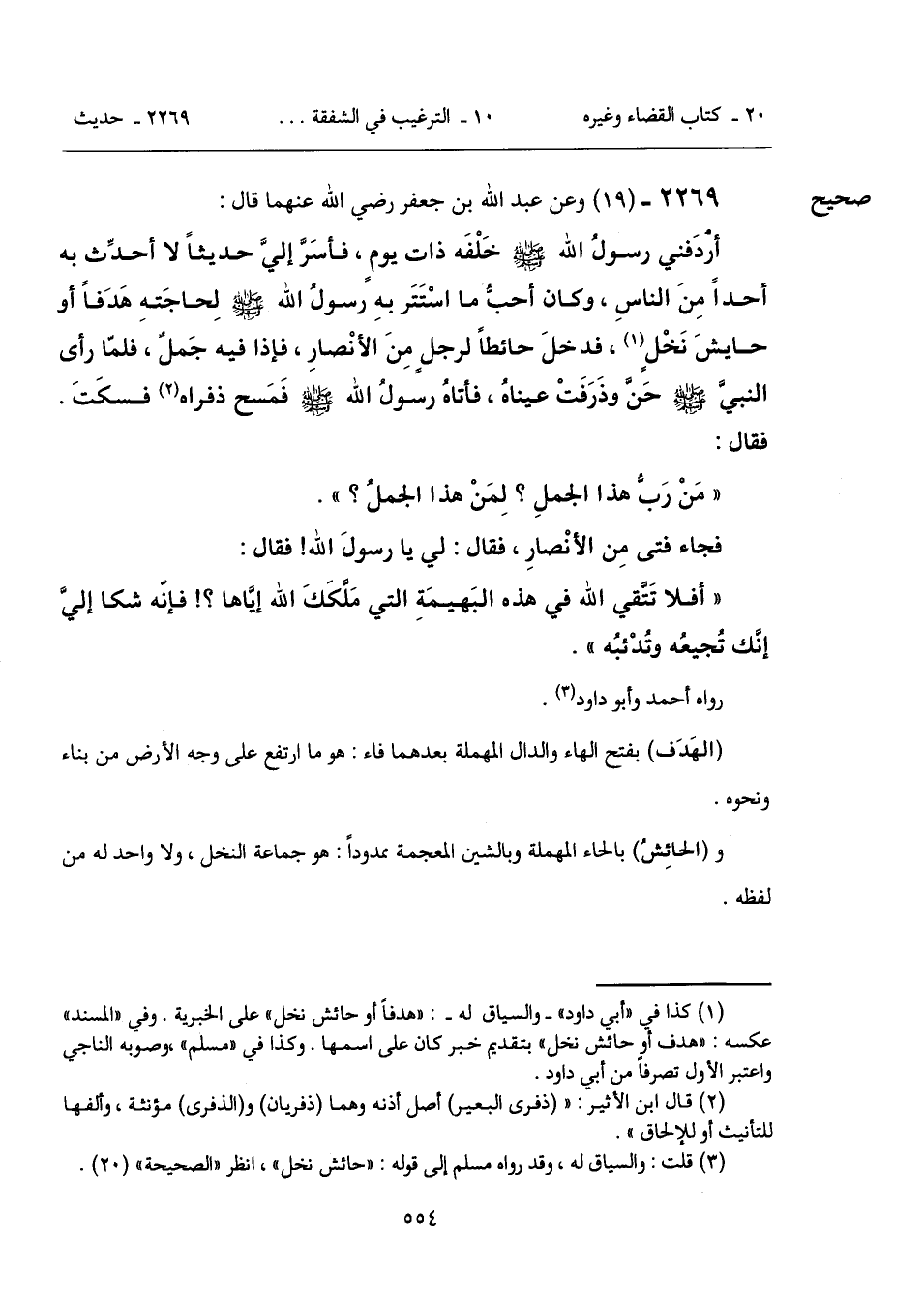أرْدَفني رسولُ الله - صَلَّى اللهُ عَلَيْهِ وَسَلَّمَ - خلْفَه ذات يومٍ، فأسَرَّ إليَّ حديثاً لا أحدِّث به أحداً مِنَ الناسِ، وكان أحبُّ ما اسْتَتَر بهِ رسولُ الله - صَلَّى اللهُ عَلَيْهِ وَسَلَّمَ - لِحاجَتهِ هَدَفاً أو حايشَ نَخْلٍ (¬1)، فدخلَ حائطاً لرجل مِنَ الأنْصارِ، فإذا فيه جَملٌ، فلمَّا رأى النبيَّ - صَلَّى اللهُ عَلَيْهِ وَسَلَّمَ - حَنَّ وذَرَفَتْ عيناهُ، فأتاهُ رسولُ الله - صَلَّى اللهُ عَلَيْهِ وَسَلَّمَ - فَمَسح ذفراه (¬2) فسكَتَ. فقال:
