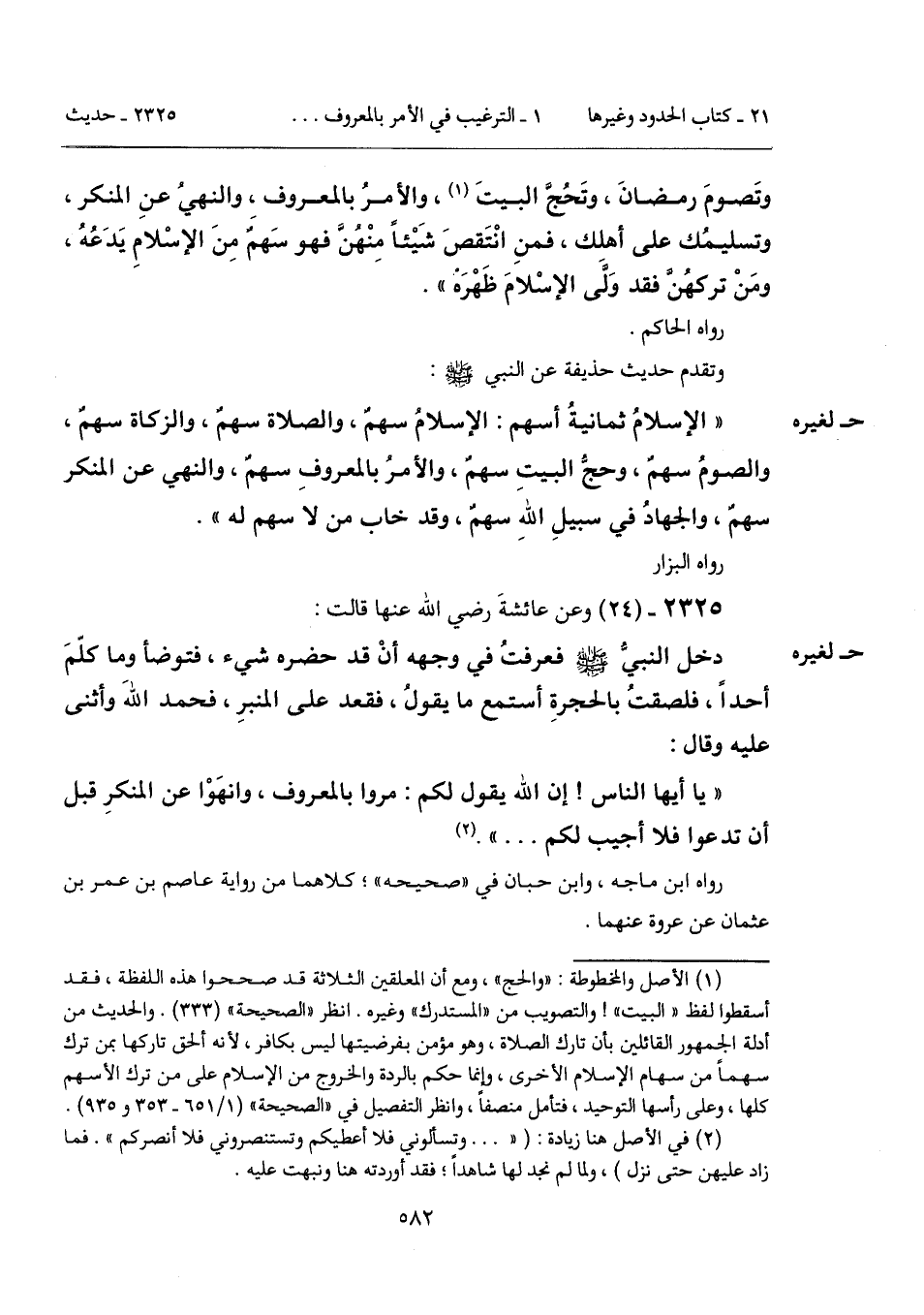 (¬1) الأصل والمخطوطة: "والحج"، ومع أن المعلقين الثلاثة قد صححوا هذه اللفظة، فقد أسقطوا لفظ "البيت"! والتصويب من "المستدرك" وغيره. انظر "الصحيحة" (333). والحديث من أدلة الجمهور القائلين بأن تارك الصلاة، وهو مؤمن بفرضيتها ليس بكافر، لأنه ألحق تاركها بمن ترك سهماً من سهام الإسلام الأخرى، وإنما حكم بالردة والخروج من الإسلام على من ترك الأسهم كلها، وعلى رأسها التوحيد، فتأمل منصفاً، وانظر التفصيل في "الصحيحة" (1/ 651 - 353 و935).
