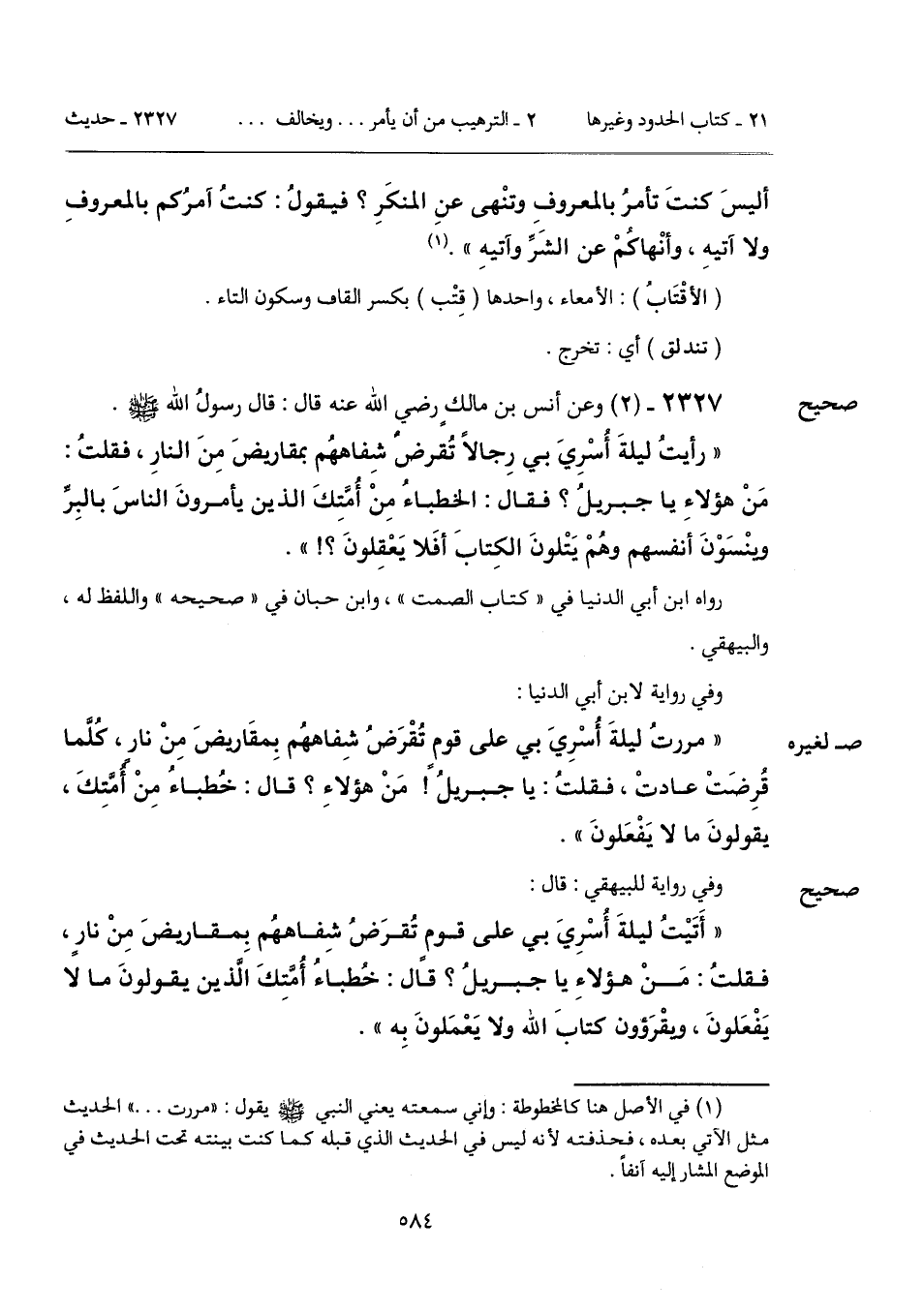 "مررتُ ليلةَ أُسْرِيَ بي على قومٍ تُقْرَضُ شِفاههُم بِمقَاريضَ مِنْ نارٍ، كُلَّما قُرِضَتْ عادتْ، فقلتُ: يا جبريلُ! مَنْ هؤلاءِ؟ قال: خُطباءُ مِنْ أُمَّتِكَ، يقولونَ ما لا يَفْعَلونَ".