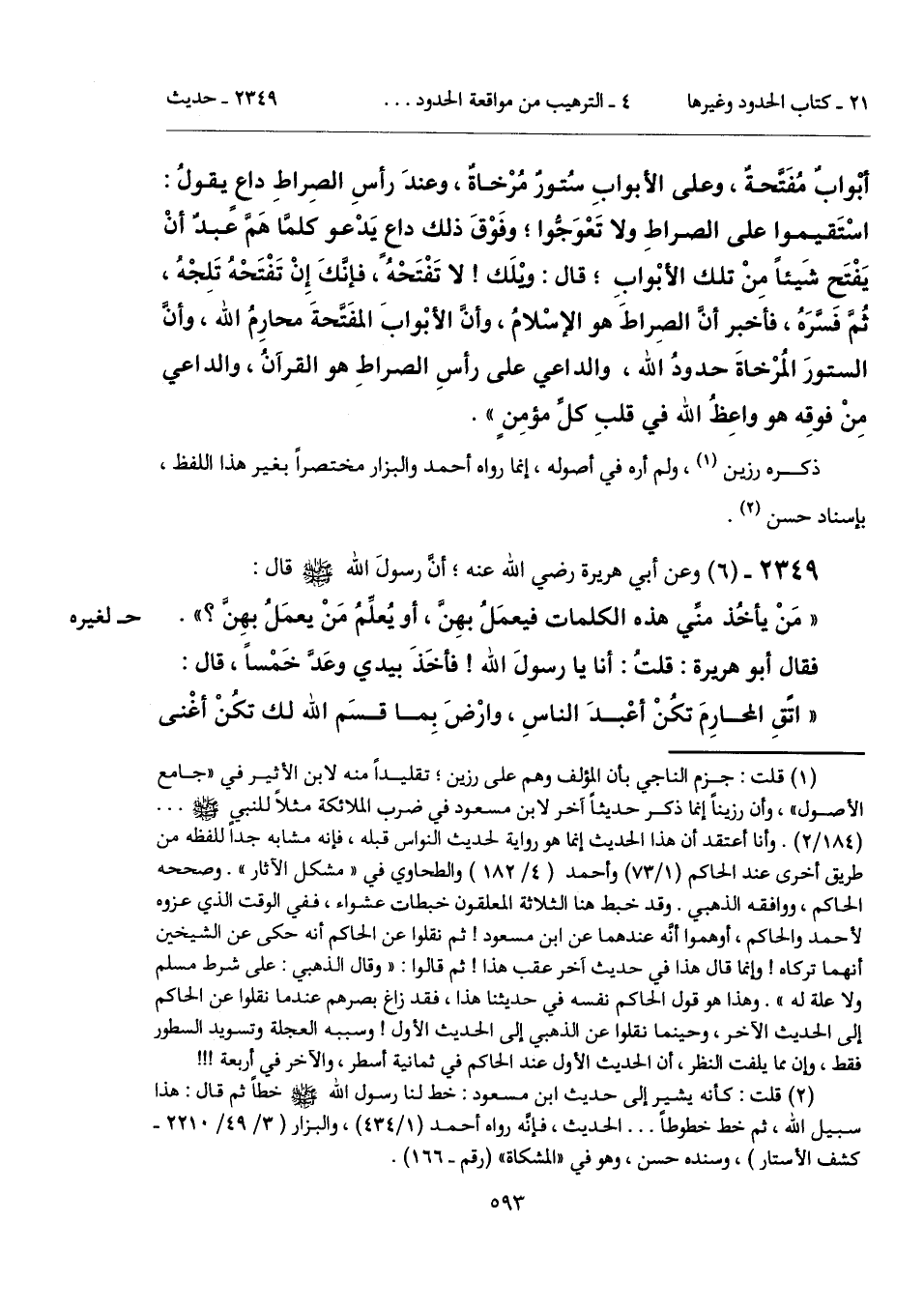 أبْوابٌ مُفَتَّحةٌ، وعلى الأبوابِ سُتورٌ مُرْخاةٌ، وعندَ رأسِ الصِراطِ داعٍ يقولُ: اسْتَقيموا على الصراطِ ولا تَعْوَجُّوا؛ وفَوْقَ ذلك داعٍ يَدْعو كلمَّا هَمَّ عبدٌ أنْ يَفْتَح شَيئاً مِنْ تلك الأبْوابِ؛ قال: وْيلَك! لا تَفْتَحْهُ، فإنَّكَ إِنْ تَفْتَحْهُ تَلِجْهُ، ثُمَّ فَسَّرَهُ، فأخبر أنَّ الصِراطَ هو الإسْلامُ، وأنَّ الأبْوابَ المفَتَّحةَ محارِمُ الله، وأنَّ الستورَ المُرْخاةَ حدودُ الله، والداعي على رأسِ الصراطِ هو القرآنُ، والداعي مِنْ فوقِه هو واعِظُ الله في قلبِ كلِّ مؤمِنٍ".