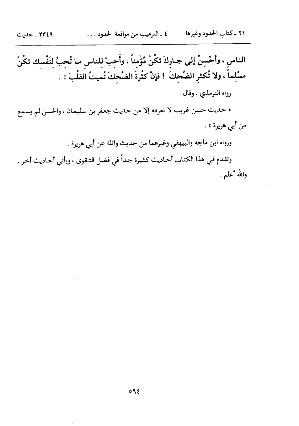 الناسِ، وأحْسِنْ إلى جارِكَ تكُنْ مُؤْمِناً، وأَحِبَّ لِلناسِ ما تُحِبُّ لِنَفْسِك تكُنْ مسْلِماً، ولا تُكثرِ الضَّحِكَ! فإنَّ كثْرةَ الضَّحِكَ تُميتُ القلْبَ".