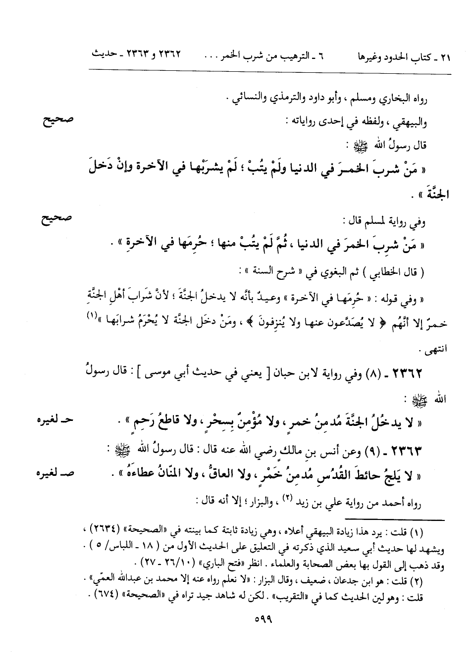 "لا يدخُلُ الجنَّةَ مُدمِنُ خمرٍ، ولا مُؤْمِنٌ بِسِحْرٍ، ولا قاطعُ رَحِمٍ".