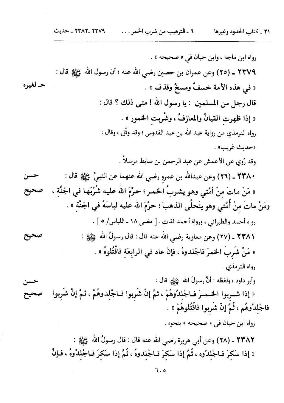 "إذا شرِبوا الخمرَ فاجْلِدُوهُمْ، ثمَّ إنْ شَرِبوا فاجْلِدوهُمْ، ثُمَّ إنْ شَرِبوا فاجْلِدُوهُم، ثُمَّ إنْ شَرِبوا فاقْتُلوهُمْ".