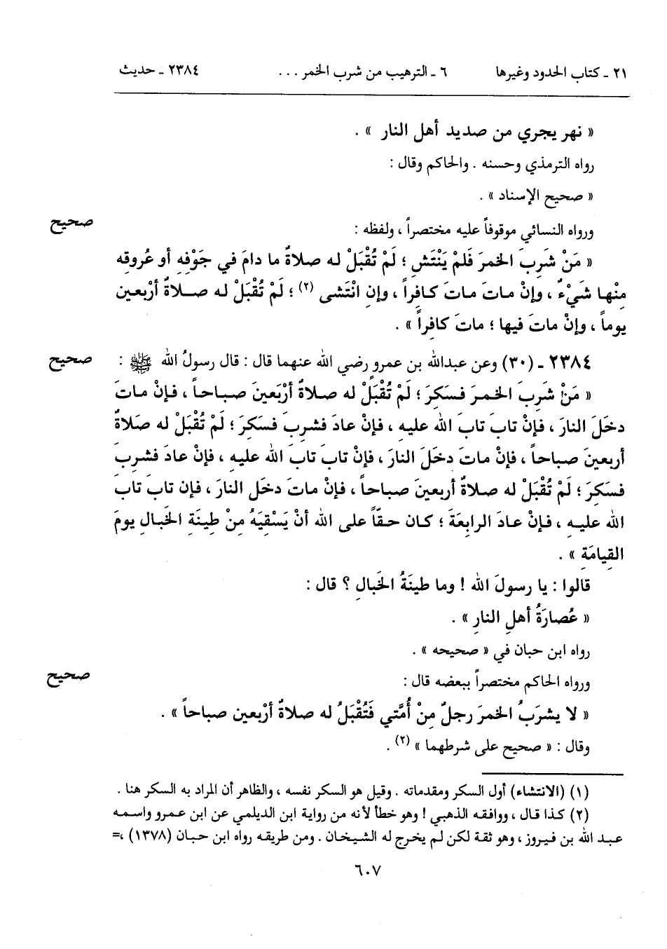 "مَن شَرِبَ الخمرَ فسَكِرَ؛ لَمْ تُقْبَلْ له صلاةٌ أربَعينَ صباحاً، فإنْ ماتَ دخَلَ النارَ، فإنْ تابَ تابَ الله عليه، فإنْ عادَ فشرِب فسَكِرَ؛ لَمْ تُقْبَلْ له صلاةٌ أربعينَ صباحاً، فإنْ ماتَ دخَلَ النارَ، فإنْ تابَ تابَ الله عليه، فإنْ عادَ فشرِبَ فسَكِرَ؛ لَمْ تُقْبَلْ له صلاةٌ أربعينَ صباحاً، فإنْ ماتَ دخَل النارَ، فإن تابَ تابَ الله عليهِ، فإنْ عادَ الرابِعَةَ؛ كان حقّاً على الله أنْ يَسْقِيَهُ مِنْ طِينَةِ الخَبالِ يومَ القِيامَة".