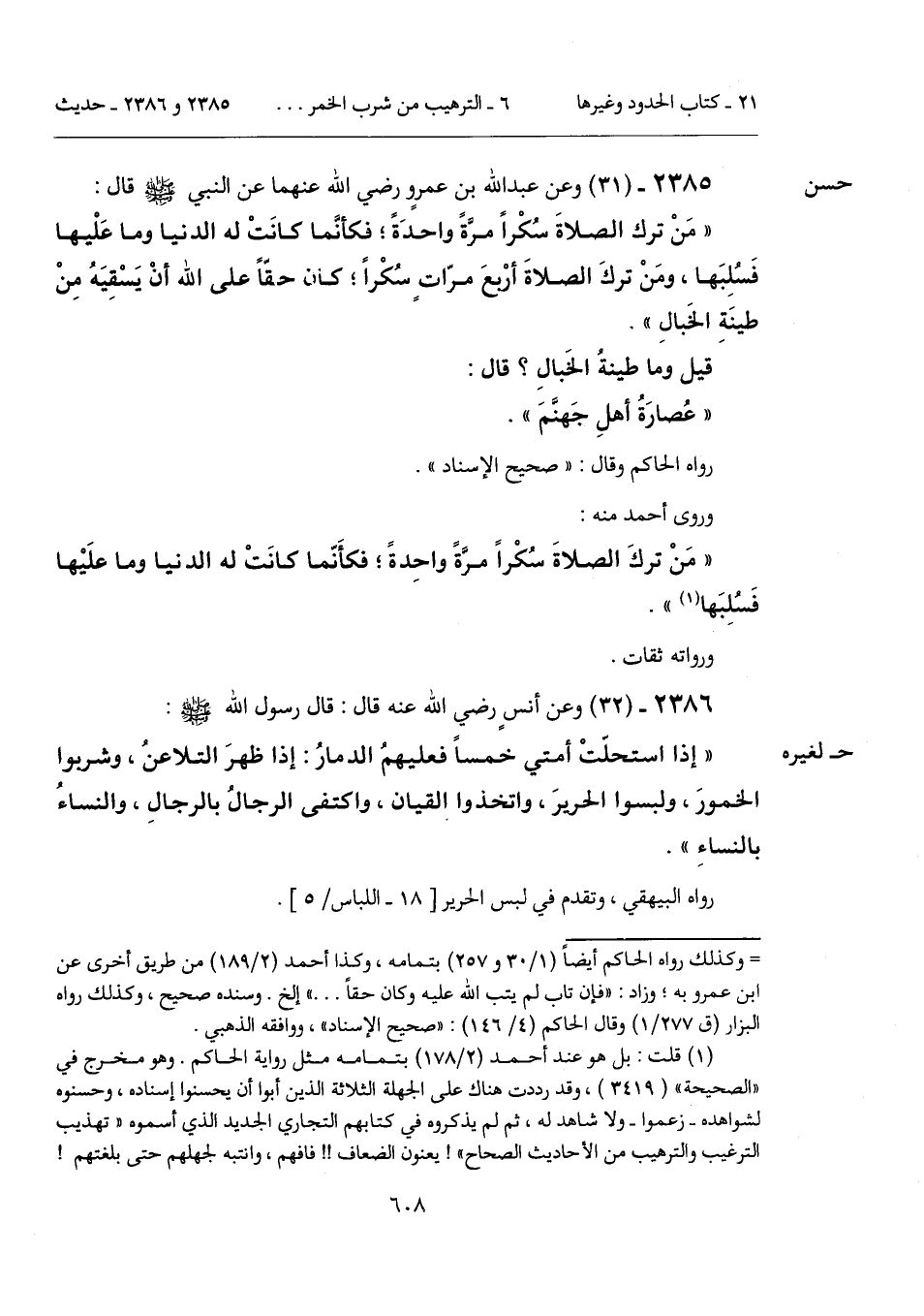 "مَنْ ترك الصلاةَ سُكْراً مرَّةً واحدَةً؛ فكأنَّما كانَتْ له الدنيا وما عَلْيها فَسُلِبَها، ومَنْ تركَ الصلاةَ أرْبعَ مرّاتٍ سُكْراً؛ كان حقّاً على الله أنْ يَسْقِيَهُ مِنْ طينَةِ الخَبالِ".