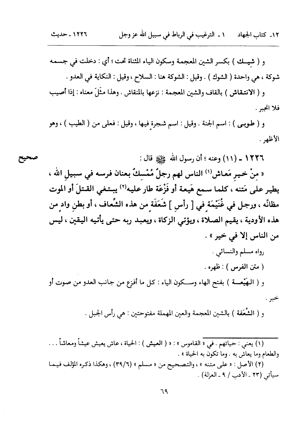 "مِنْ خيرِ مَعاش (¬1) الناس لهم رجلٌ مُمْسِكٌ بعنان فرسه في سبيلِ الله، يطير على مَتنه، كلما سمع هَيعة أو فَزْعَة طار عليه (¬2) يبتغي القتلَ أو الموت مظانَّه، ورجل في غُنَيْمَةٍ في [رأسِ] شَعَفَةٍ من هذه الشِّعاف، أو بطنِ وادٍ من هذه الأودية، يقيم الصلاة، ويؤتي الزكاة، ويعبد ربه حتى يأتيه اليقين، ليس من الناس إلا في خير".