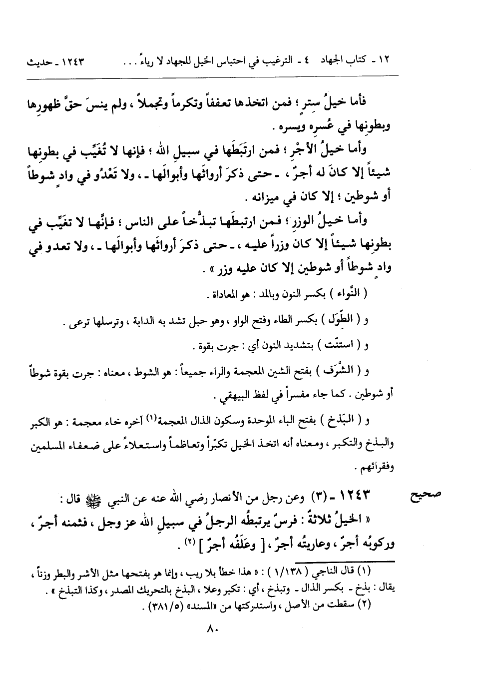 وأما خيلُ الوزرِ؛ فمن ارتبطَها تبذُّخاً على الناس؛ فإنَّها لا تغَيِّب في بطونِها شيئاً إلا كان وزراً عليه، -حتى ذكرَ أرواثَها وأبوالَها-، ولا تعدو في وادٍ شوطاً أو شوطين إلا كان عليه وزر".