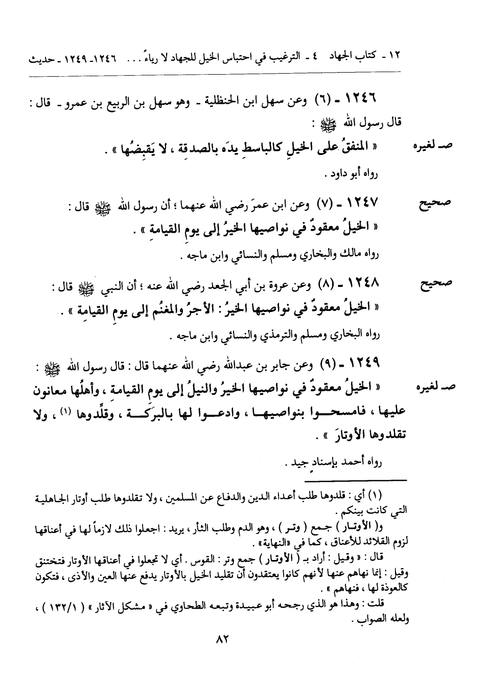 "الخيلُ معقودٌ في نواصيها الخيرُ والنيلُ إلى يومِ القيامةِ، وأهلُها معانون عليها، فامسحوا بنواصيها، وادعوا لها بالبرَكة، وقلِّدوها (¬1)، ولا تقلدوها الأوتارَ".
