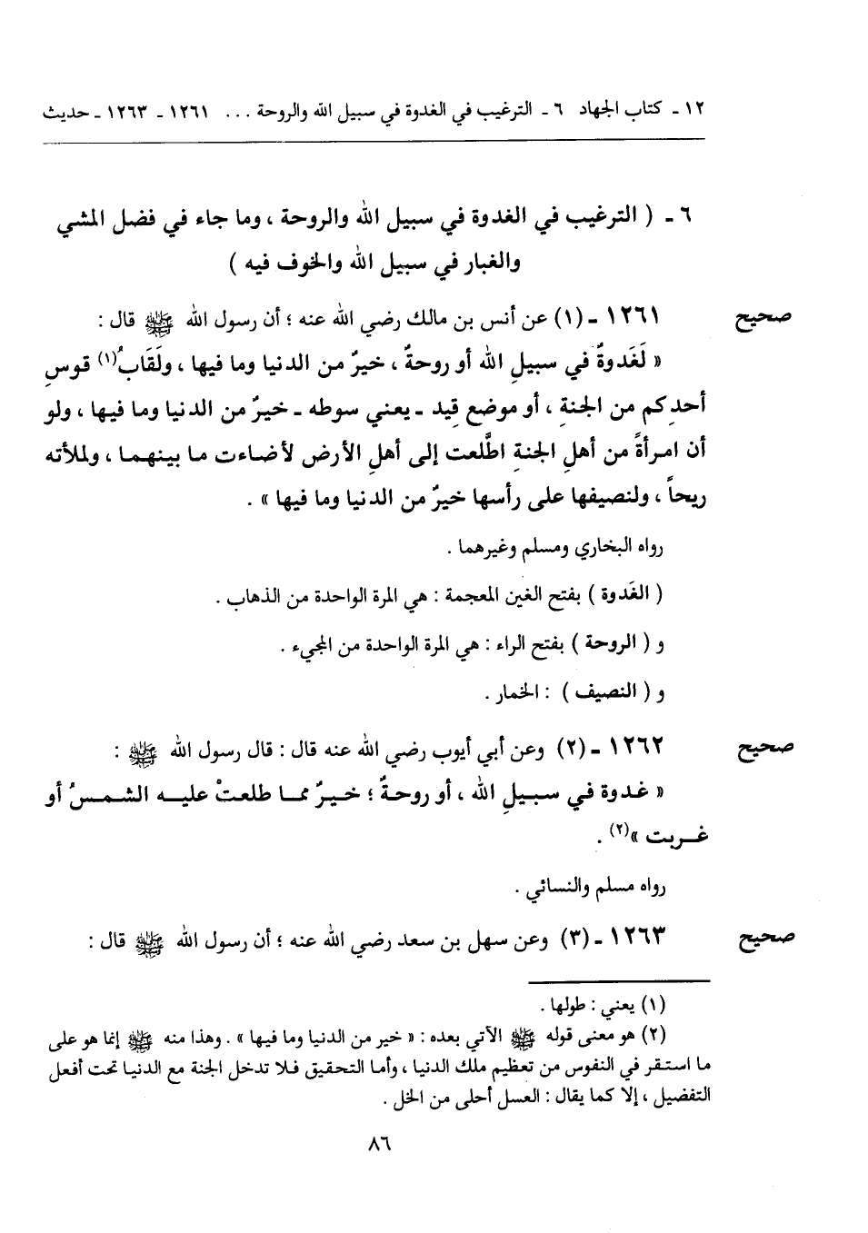 6 - (الترغيب في الغدوة في سبيل الله والروحة، وما جاء في فضل المشي والغبار في سبيل الله والخوف فيه).