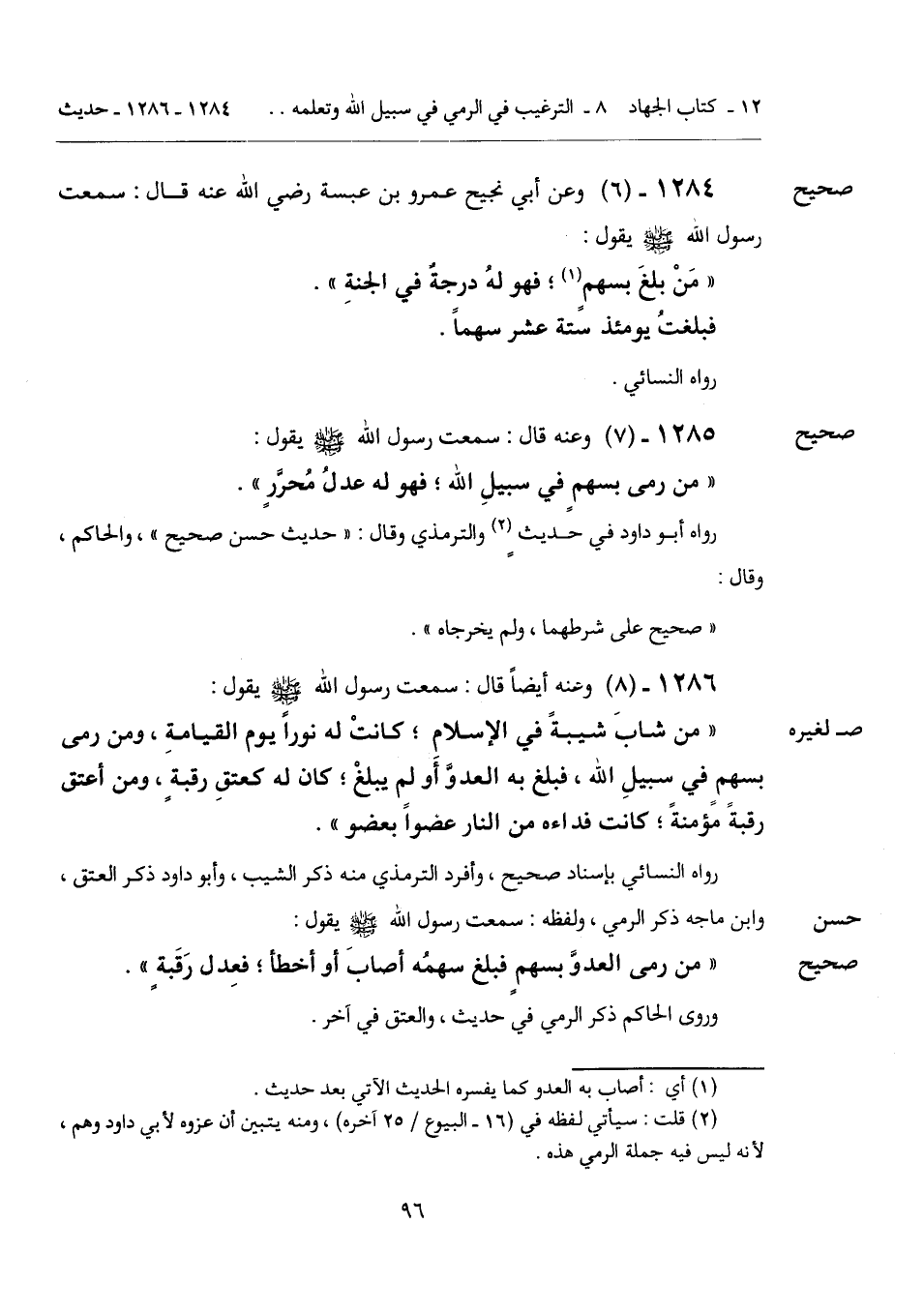 "من رمى العدوَّ بسهمٍ فبلغ سهمُه أصابَ أو أخطأ؛ فعِدل رَقَبةٍ".