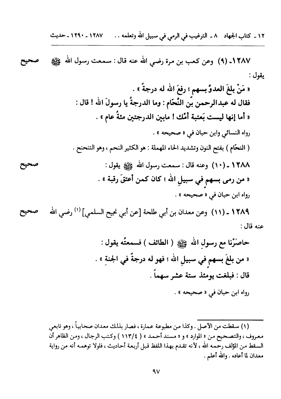 1289 - (11) [صحيح] وعن معدان بن أبي طلحة [عن أبي نجيح السلمي] (¬1) رضي الله عنه قال: