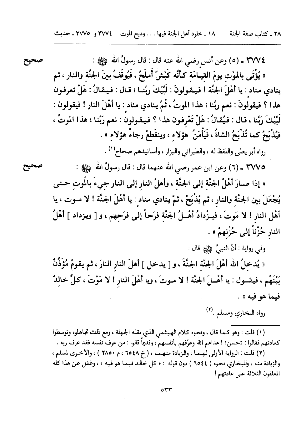 "إذا صارَ أهْل الجنَّةِ إلى الجنَّةِ، وأهلُ النارِ إلى النار جِيءَ بالمْوتِ حتى يُجْعَلَ بين الجنَّةِ والنارِ، ثم يُذْبَحُ، ثمَّ ينادي منادٍ: يا أهْلَ الجنَّة! لا موت، يا أهْل النارِ! لا مَوتَ، فيزْدادُ أهْلُ الجنَّةِ فرَحاً إلى فرَحِهم، و [ويزداد] أهْلُ النارِ حُزْناً إلى حُزْنِهمْ".