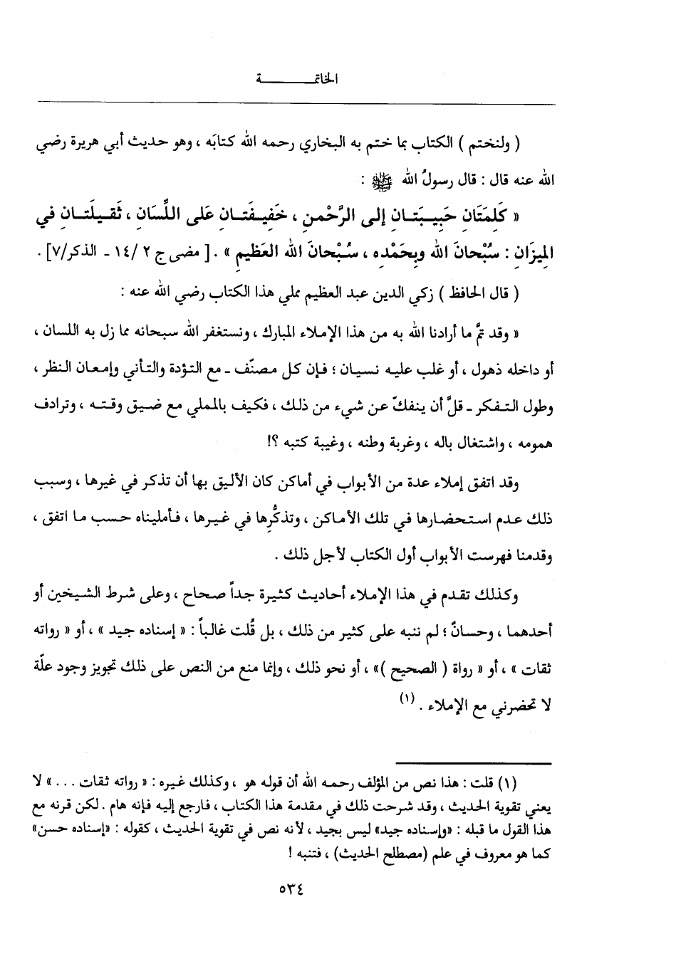 (ولنختم) الكتاب بما ختم به البخاري رحمه الله كتابَه، وهو حديث أبي هريرة رضي الله عنه قال: قال رسولُ الله - صَلَّى اللهُ عَلَيْهِ وَسَلَّمَ -: