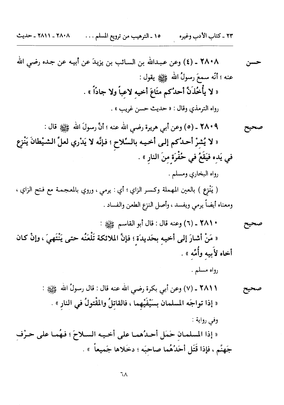 "لا يُشِرْ أحدُكم إلى أخيه بالسِّلاحِ؛ فإنَّه لا يَدْري لعلَّ الشيْطانَ يَنْزِع في يَدِه فيَقَعُ في حُفْرَةٍ مِنَ النارِ".