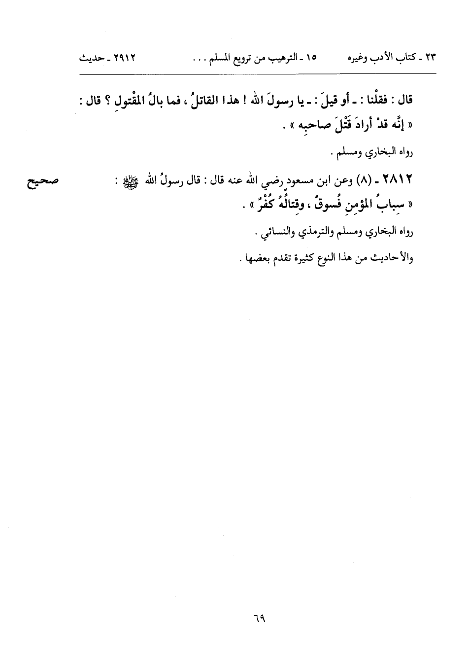 "سِبابُ المؤمِنِ فُسوقٌ، وقِتالُهُ كُفْرٌ".