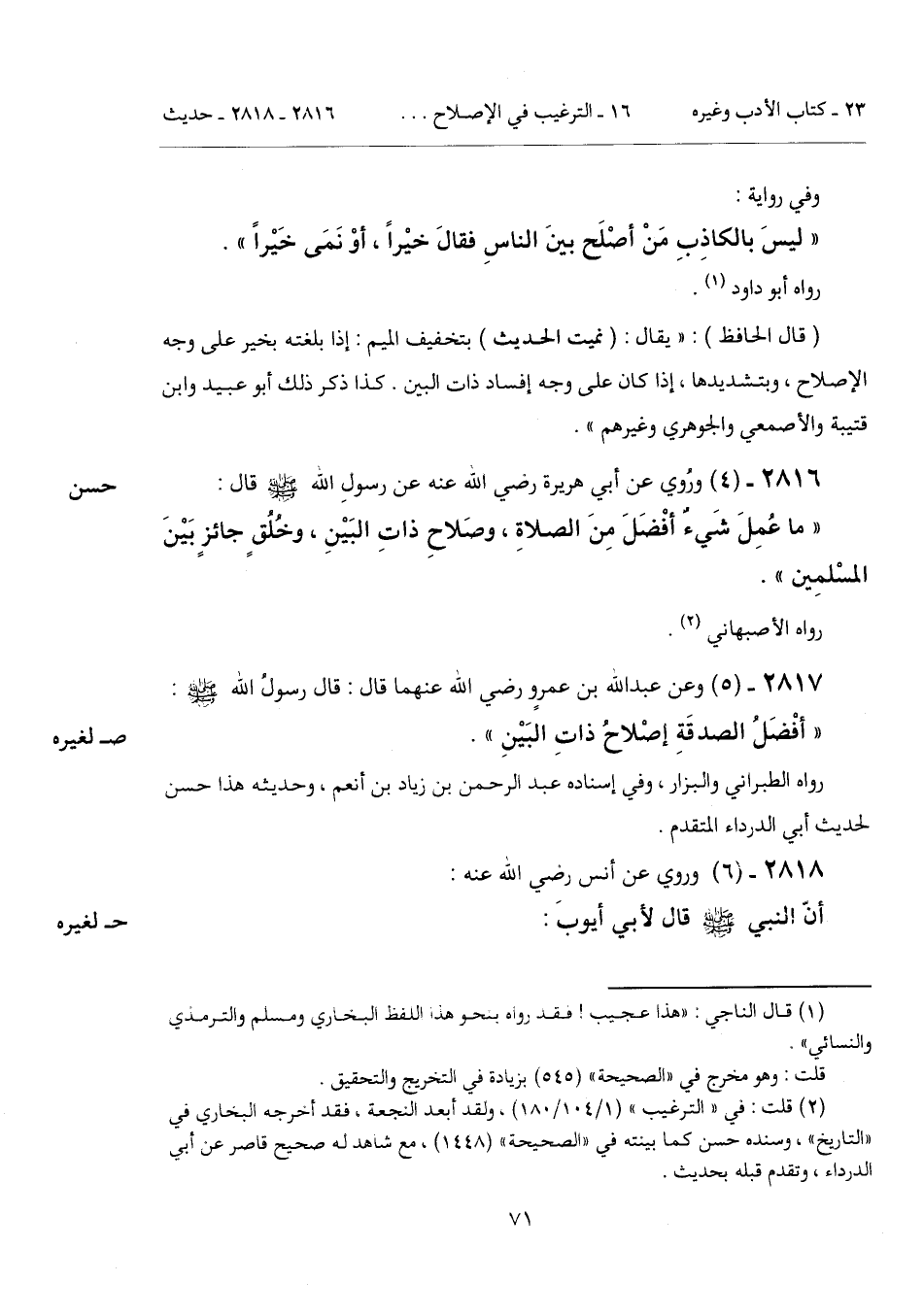 "ليسَ بالكاذِبِ مَنْ أصْلَح بينَ الناسِ فقالَ خيْراً، أوْ نَمَى خَيْراً".