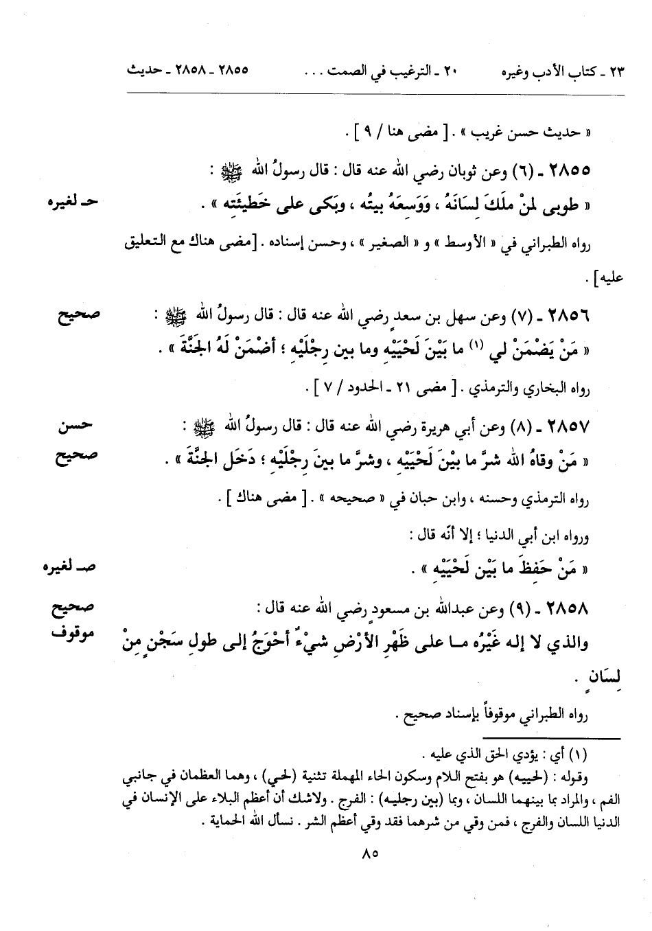 "مَنْ وقاهُ الله شرَّ ما بيْنَ لَحْيَيْهِ، وشرَّ ما بينَ رِجْلَيْهِ؛ دَخَل الجنَّةَ".