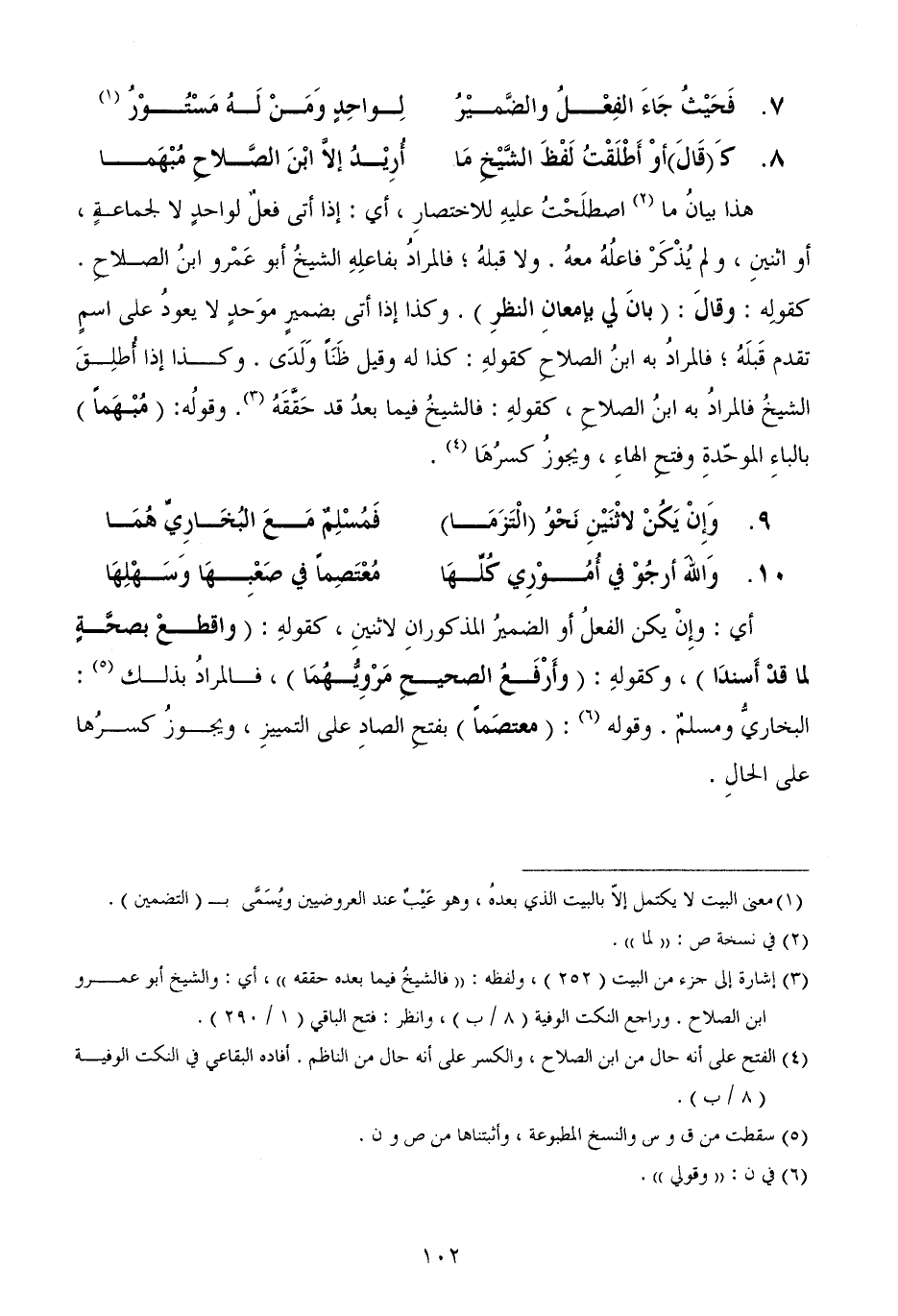 هذا بيانُ ما اصطلَحْتُ عليهِ للاختصارِ، أي: إذا أتى فعلٌ لواحدٍ لا لجماعةٍ، أو اثنينِ، ولم يُذْكَرْ فاعلُهُ معهُ. ولا قبلهُ؛ فالمرادُ بفاعلِهِ الشيخُ أبو عَمْرو ابنُ الصلاحِ. كقولِه: وقالَ: (بانَ لي بإمعانِ النظرِ) . وكذا إذا أتى بضميرٍ موَحدٍ لا يعودُ على اسمٍ تقدم قَبلَهُ؛ فالمرادُ به ابنُ الصلاحِ كقولهِ: كذا له وقيل ظَنَاً وَلَدَى. وكذا إذا أُطلِقَ الشيخُ فالمرادُ به ابنُ الصلاحِ، كقولهِ: فالشيخُ فيما بعدُ قد حَقَّقَهُ. وقولُه: (مُبْهَماً) بالباءِ الموحّدةِ وفتحِ الهاءِ، ويجوزُ كسرُهَا.