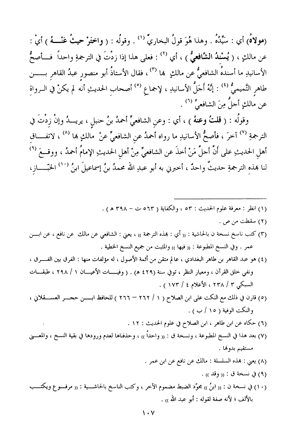 (مولاهُ) أي: سَيِّدُهُ. وهذا هُوَ قولُ البخاريِّ. وقولُه: (واختَرْ حيثُ عَنْهُ) أيْ: عن مالكٍ، (يُسْنِدُ الشَّافعيُّ) ، أي: فعلى هذا إذا زدْتَ في الترجمةِ واحداً فأصحُّ الأسانيدِ ما أسندهُ الشافعيُّ عن مالكٍ بها، فقال الأستاذُ أبو منصورٍ عبدُ القاهرِ بن طاهرٍ التَّميميُّ: إنَّهُ أَجَلُّ الأسانيدِ، لإجماعِ أصحابِ الحديثِ أنه لم يكنْ في الرواةِ عن مالكٍ أجلُّ مِنَ الشافعيِّ.