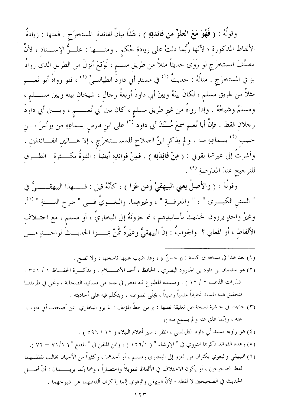 وقولُهُ: (فَهُوَ مَعَ العلوِّ من فائدتِهِ) ، هَذَا بيانٌ لفائدةِ المستخرَجِ. فمنها: زيادةُ الألفاظِ المذكورةِ؛ لأنّها رُبَّما دلتْ على زيادةِ حُكمٍ. ومنها: علوُّ الإسنادِ؛ لأنَّ مصنِّفَ المستخرَجِ لو رَوَى حديثاً مثلاً من طريقِ مسلمٍ، لَوَقعَ أنزلَ من الطريقِ الذي رواهُ بهِ في المستخرَجِ. مثالُهُ: حديثٌ في مسندِ أبي داودَ الطيالسيِّ، فلو رواهُ أبو نُعيم مثلاً من طريق مسلمٍ، لكانَ بينَهُ وبينَ أبي داودَ أربعةُ رجالٍ، شيخانِ بينه وبين مسلمٍ، ومسلمٌ وشيخُهُ. وإذا رواهُ من غيرِ طريقِ مسلمٍ، كان بين أبي نُعيمٍ، وبين أبي داودَ رجلانِ فقط. فإنَّ أبا نُعيم سمعَ مُسْنَدَ أبي داود على ابنِ فارسٍ بسماعِهِ من يونُسَ بنِ حبيبٍ بسماعِهِ منه، ولم يذكرِ ابنُ الصلاحِ للمستخرَجِ، إلا هاتينِ الفائدتينِ. وأشرتُ إلى غيرهما بقولي: (مِنْ فائِدَتِه) . فمِنْ فوائدِهِ أيضاً: القوةُ بكثرةِ الطرقِ للترجيحِ عندَ المعارضةِ.