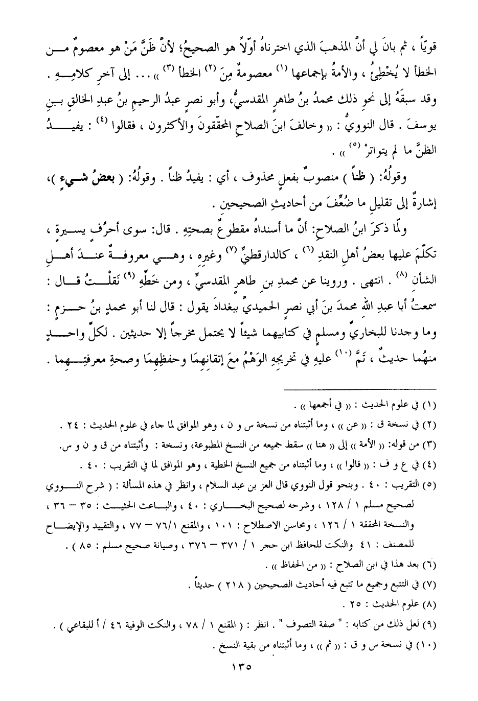 قويّاً، ثم بانَ لي أنَّ المذهبَ الذي اخترناهُ أوّلاً هو الصحيحُ؛ لأنَّ ظَنَّ مَنْ هو معصومٌ من الخطأ لا يُخْطِئُ، والأمةُ بإجماعها معصومةٌ مِنَ الخطأ)) ... إلى آخرِ كلامِهِ. وقد سبقَهُ إلى نحوِ ذلك محمدُ بنُ طاهرٍ المقدسيُّ، وأبو نصرٍ عبدُ الرحيمِ بنُ عبدِ الخالقِ بنِ يوسفَ. قال النوويُّ: ((وخالفَ ابنَ الصلاحِ المحقّقونَ والأكثرون، فقالوا: يفيدُ الظنَّ ما لم يتواترْ)) .
