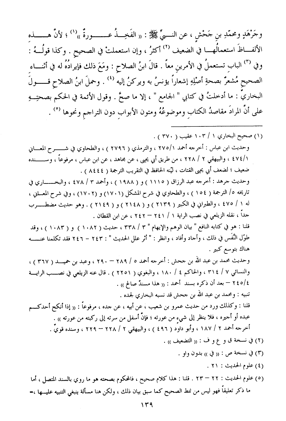 وجَرْهَدٍ ومحمّدِ بنِ جَحْشٍ، عن النبيِّ - صَلَّى اللهُ عَلَيْهِ وَسَلَّمَ -: ((الفَخِذُ عورةٌ)) ؛ لأنَّ هذهِ الألفاظَ استعمالُها في الضعيف أكثرُ، وإن استعملتْ في الصحيحِ. وكذا قولُهُ: وفي البابِ تستعملُ في الأمرينِ معاً. قالَ ابنُ الصلاحِ: ومَعَ ذلك فإيرادُهُ له في أثناءِ الصحيحِ مُشعرٌ بصحةِ أصْلِهِ إشعاراً يؤنسُ به ويركنُ إليه. وحملَ ابنُ الصلاحِ قولَ البخاريِّ: ما أدخلتُ في كتابي " الجامع "، إلا ما صحَّ. وقول الأئمة في الحكم بصحتِهِ على أنَّ المرادَ مقاصدُ الكتابِ وموضوعُهُ ومتون الأبوابِ دون التراجمِ ونحوها.