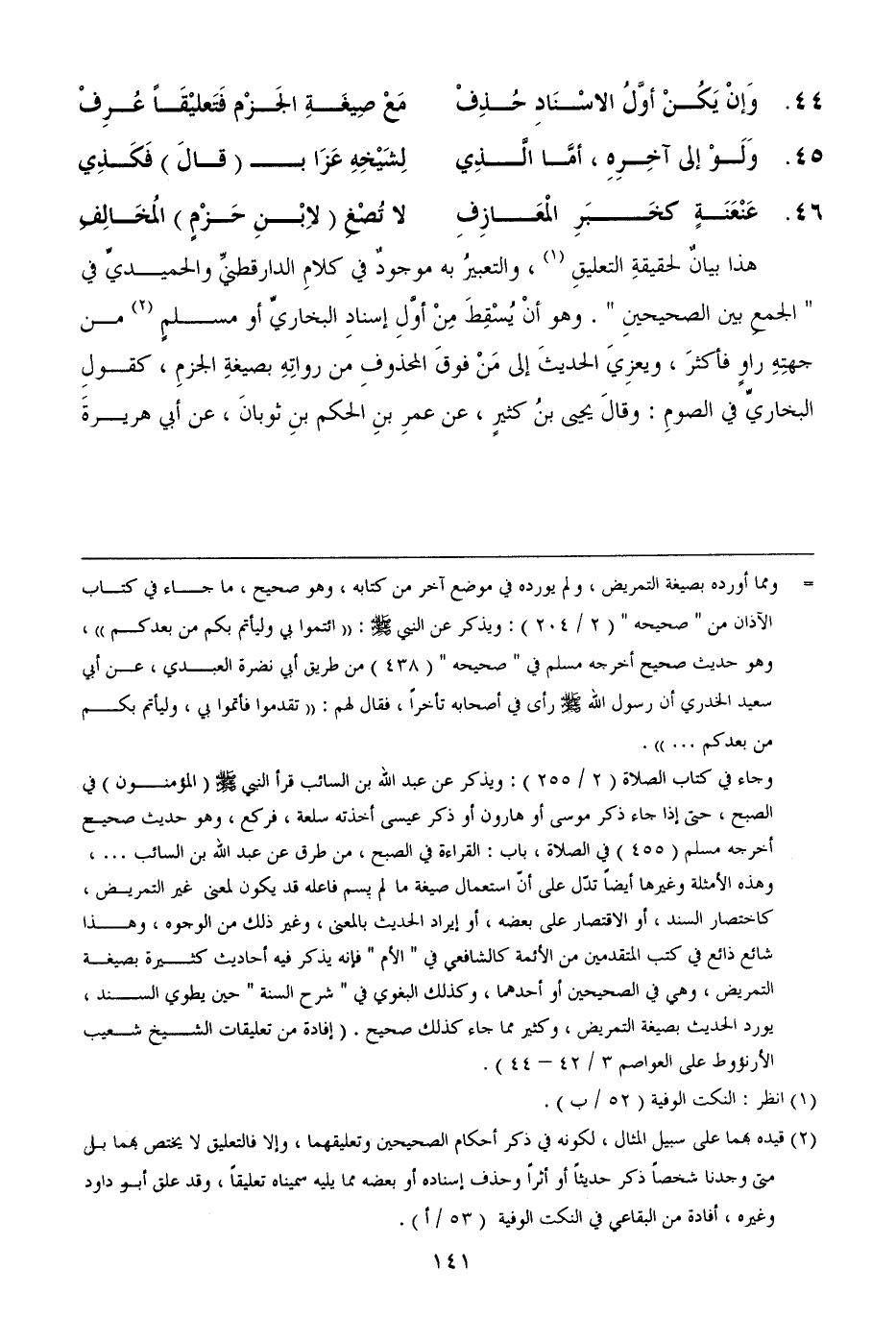 44.... وَإنْ يَكُنْ أوَّلُ الاسْنَادِ حُذِفْ ... مَعْ صِيغَةِ الجَزْم فَتَعليْقَاً عُرِفْ