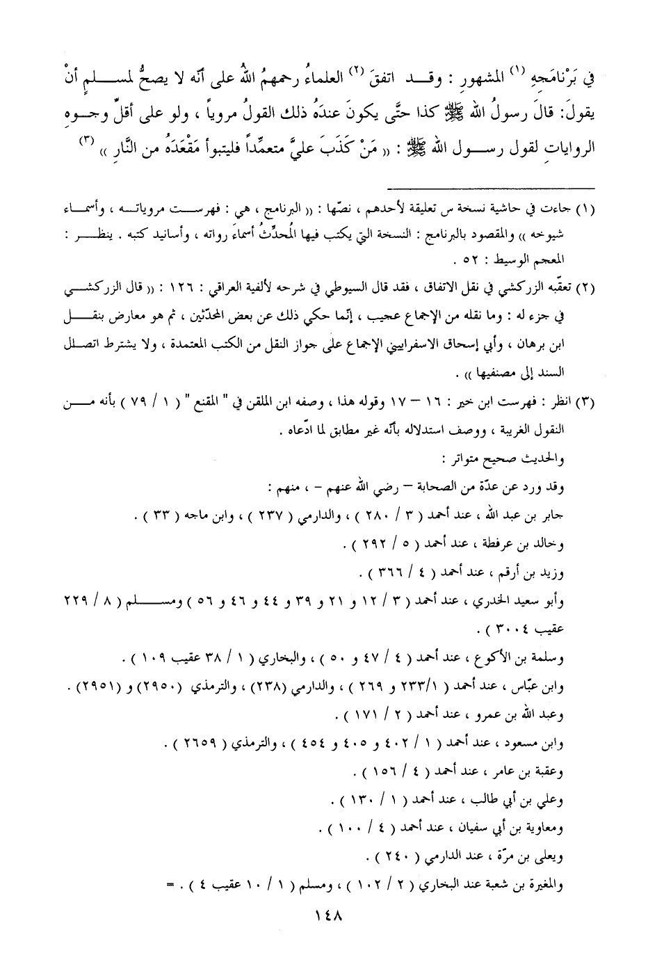 في بَرْنامَجِهِ المشهورِ: وقد اتفقَ العلماءُ رحمهمُ اللهُ على أنّه لا يصحُّ لمسلمٍ أنْ يقولَ: قالَ رسولُ الله - صَلَّى اللهُ عَلَيْهِ وَسَلَّمَ - كذا حتَّى يكونَ عندَهُ ذلك القولُ مروياً، ولو على أقلِّ وجوهِ الرواياتِ لقول رسول الله - صَلَّى اللهُ عَلَيْهِ وَسَلَّمَ -: ((مَنْ كَذَبَ عليَّ متعمِّداً فليتبوأ مَقْعَدَهُ من النَّارِ))