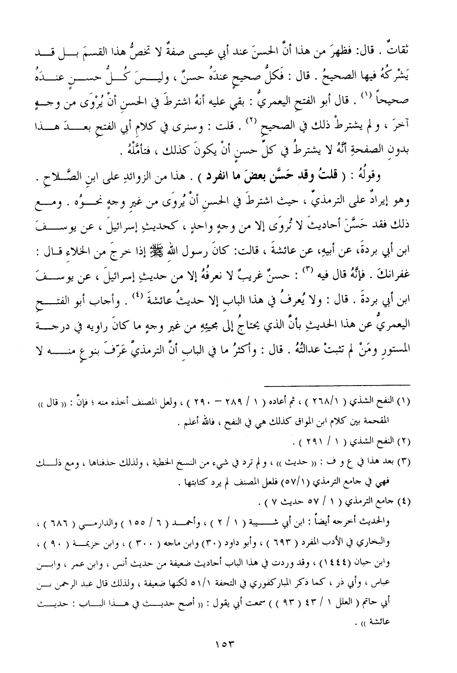 ثقاتٌ. قال: فظهرَ من هذا أنَّ الحسنَ عند أبي عيسى صفةٌ لا تخصُّ هذا القسمَ بل قد يَشْركُهُ فيها الصحيحُ. قال: فَكلُّ صحيحٍ عندَهُ حسنٌ، وليسَ كُلُّ حسنٍ عندَهُ صحيحاً. قال أبو الفتحِ اليعمريُّ: بقي عليه أنهُ اشترطَ في الحسنِ أنْ يُرْوَى من وجهٍ آخرَ، ولم يشترطْ ذلك في الصحيحِ. قلت: وسنرى في كلامِ أبي الفتحِ بعدَ هذا بدونِ الصفحةِ أنَّهُ لا يشترطُ في كلِّ حسنٍ أنْ يكونَ كذلك، فتأمَّلْهُ.