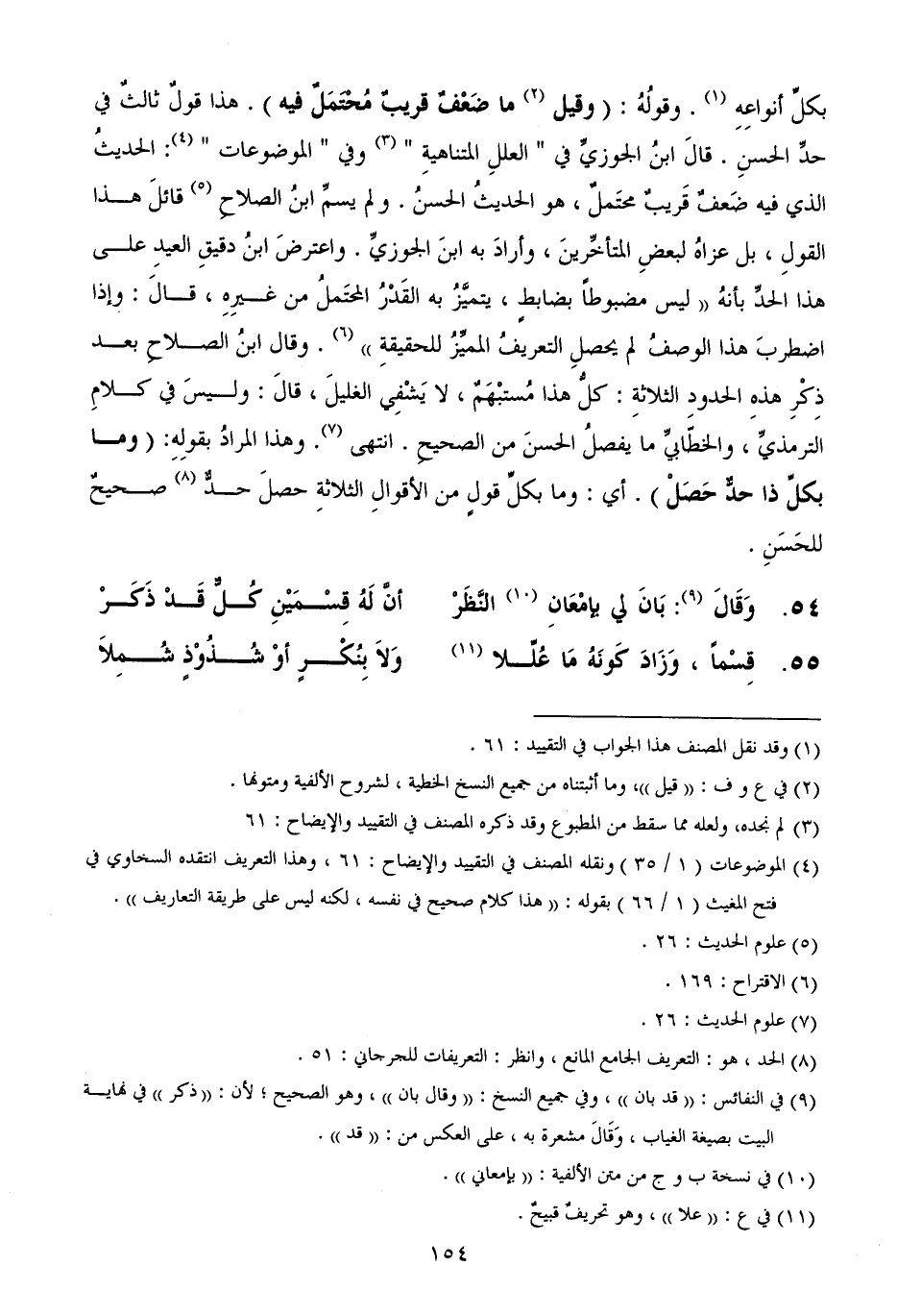 بكلِّ أنواعِهِ. وقولُهُ: (وقيل ما ضَعْفٌ قريبٌ مُحْتَمَلٌ فيه) . هذا قولٌ ثالثٌ في حدِّ الحسنِ. قالَ ابنُ الجوزيِّ في " العللِ المتناهيةِ " وفي " الموضوعات ": الحديثُ الذي فيه ضَعفٌ قَريبٌ محتَملٌ، هو الحديثُ الحسنُ. ولم يسمِّ ابنُ الصلاحِ قائلَ هذا القولِ، بل عزاهُ لبعضِ المتأخِّرينَ، وأرادَ به ابنَ الجوزيِّ. واعترضَ ابنُ دقيقِ العيدِ على هذا الحدِّ بأنهُ ((ليس مضبوطاً بضابطٍ، يتميَّزُ به القَدْرُ المحتَملُ من غيرِهِ، قالَ: وإذا اضطربَ هذا الوصفُ لم يحصلِ التعريفُ المميِّزُ للحقيقةِ)) . وقال ابنُ الصلاحِ بعد ذِكْرِ هذهِ الحدودِ الثلاثةِ: كلُّ هذا مُستبْهَمٌ، لا يَشْفِي الغليلَ، قالَ: وليسَ في كلامِ الترمذيِّ، والخطّابيِّ ما يفصلُ الحسنَ من الصحيحِ. انتهى. وهذا المرادُ بقولِهِ: (وما بكلِّ ذا حدٌّ حَصَلْ) . أي: وما بكلِّ قولٍ من الأقوالِ الثلاثةِ حصلَ حدٌّ صحيحٌ للحَسَنِ.