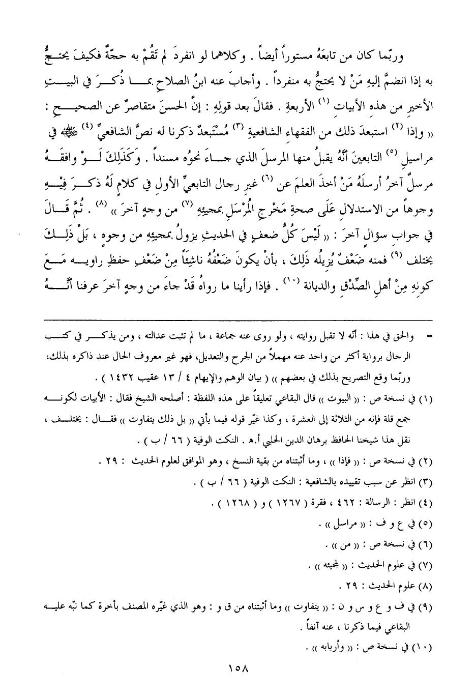 وربّما كان من تابعَهُ مستوراً أيضاً. وكلاهما لو انفردَ لم تَقُمْ به حجّةٌ فكيفَ يحتجُّ به إذا انضمَّ إليهِ مَنْ لا يحتجُّ به منفرداً. وأجابَ عنه ابنُ الصلاحِ بما ذُكرَ في البيتِ الأخيرِ من هذهِ الأبياتِ الأربعةِ. فقالَ بعد قولِهِ: إنَّ الحسنَ متقاصرٌ عن الصحيحِ: ((وإذا استبعدَ ذلك من الفقهاءِ الشافعيةِ مُسْتَبعدٌ ذكرنا له نصَّ الشافعيِّ (في مراسيلِ التابعينَ أنَّهُ يقبلُ منها المرسلَ الذي جاءَ نحوُه مسنداً. وَكَذَلِكَ لَوْ وافقَهُ مرسلٌ آخرُ أرسلَهُ مَنْ أخذَ العلمَ عن غيرِ رجال التابعيِّ الأولِ في كلامٍ لَهُ ذكرَ فِيْهِ وجوهاً من الاستدلالِ عَلَى صحةِ مَخْرجِ المُرْسَلِ بمجيئِهِ من وجهٍ آخرَ)) . ثُمَّ قَالَ في جوابِ سؤالٍ آخرَ: ((لَيْسَ كُلُّ ضعفٍ في الحديثِ يزولُ بمجيئِهِ من وجوهٍ، بَلْ ذَلِكَ يختلف فمنه ضَعْفٌ يُزِيلُه ذَلِكَ، بأنْ يكونَ ضَعْفُهُ ناشِئَاً مِنْ ضَعْفِ حفظِ راويه مَعَ كونِهِ مِنْ أهلِ الصِّدْقِ والديانة. فإذا رأينا ما رواهُ قَدْ جاءَ من وجهٍ آخرَ عرفنا أنَّهُ