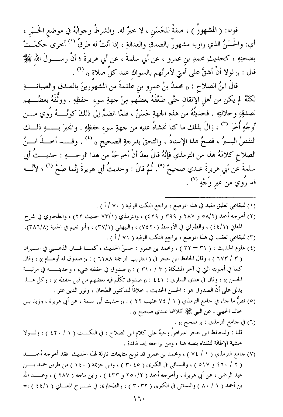 قوله المشهورُ، صفةٌ للحَسَنِ، لا خبرٌ له والشرطُ وجوابُهُ في موضعِ الخَبَرِ، أي والحَسَنُ الذي راويه مشهورٌ بالصدقِ والعدالةِ، إذا أتَتْ له طرقٌ أخرى حكمَتْ بصحتِهِ، كحديثِ محمدِ بنِ عمرو، عن أبي سلمةَ، عن أبي هريرةَ؛ أنَّ رسولَ اللهِ - صَلَّى اللهُ عَلَيْهِ وَسَلَّمَ - قال لولا أنْ أشقَّ على أمتي لأمرتُهم بالسواكِ عند كلِّ صلاةٍ