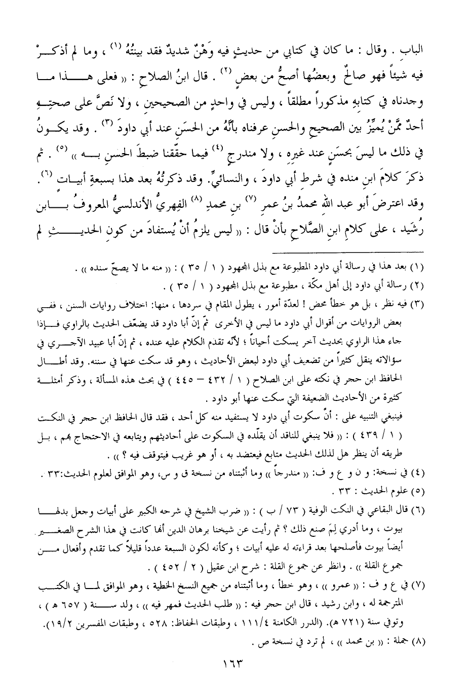 البابِ. وقال: ما كان في كتابي من حديثٍ فيه وَهْنٌ شديدٌ فقد بينتُهُ، وما لم أذكرْ فيه شيئاً فهو صالحٌ وبعضُها أصحُّ من بعضٍ. قال ابنُ الصلاحِ: ((فعلى هذا ما وجدناه في كتابِهِ مذكوراً مطلقاً، وليس في واحدٍ من الصحيحينِ، ولا نَصَّ على صحتِهِ أحدٌ ممَّنْ يُميِّزُ بين الصحيحِ والحسنِ عرفناه بأنَّهُ من الحسَنِ عند أبي داودَ. وقد يكونُ في ذلك ما ليسَ بحسَنٍ عند غيرِهِ، ولا مندرجٍ فيما حقّقنا ضبطَ الحسنِ به)) . ثم ذكرَ كلامَ ابنِ منده في شرطِ أبي داودَ، والنسائيِّ. وقد ذكرتُهُ بعد هذا بسبعةِ أبياتٍ. وقد اعترضَ أبو عبد اللهِ محمدُ بنُ عمرِ بنِ محمدِ الفِهريُّ الأندلسيُّ المعروفُ بابن رُشَيد، على كلامِ ابنِ الصَّلاحِ بأنْ قال: ((ليس يلزمُ أنْ يُستفادَ من كونِ الحديثِ لم