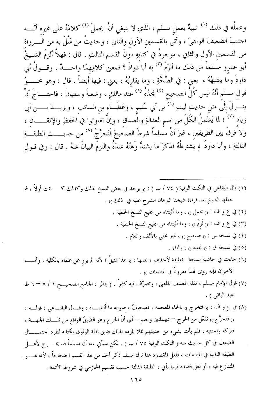 وعملُه في ذلك شبيهٌ بعملِ مسلم، الذي لا ينبغي أنْ يحملَ كلامَهُ على غيرِهِ أنّه اجتنبَ الضعيفَ الواهيَ، وأتى بالقسمينِ الأولِ والثاني، وحديثُ من مَثَّلَ به من الرواةِ من القسمينِ الأولِ والثاني، موجودٌ في كتابِهِ دونَ القسم الثالثِ قال فهلاَّ ألزمَ الشيخُ أبو عمرٍو مسلماً من ذلك ما ألزَمَ به أبا دوادَ؟ فمعنى كلامِهِمَا واحدٌ وقولُ أبي داودَ وما يشبهُهُ، يعني في الصِّحَّةِ، وما يقارِبُهُ، يعني فيها أيضاً قال وهو نحوُ قولِ مسلمٍ أنَّهُ ليس كُلُّ الصحيحِ نجدُهُ عند مالكٍ، وشعبةَ وسفيانَ، فاحتاجَ أنْ ينزلَ إِلَى مثلِ حديثِ ليثِ بن أبي سُليمٍ، وعَطَاءِ بنِ السائبِ، ويزيدَ بن أبي زيادٍ؛ لما يَشْملُ الكُلَّ من اسمِ العدالةِ والصدقِ، وإنْ تفاوتوا في الحفظِ والإتقانِ، ولا فرقَ بين الطريقينِ، غيرَ أنَّ مسلماً شرطَ الصحيحَ فَتَحرَّجَ من حديثِ الطبقةِ الثالثةِ، وأبا داودَ لم يشترطْهُ فذكرَ ما يشتدُّ وَهنُهُ عندَهُ والتزمَ البيانَ عنهُ قال وفي قولِ
