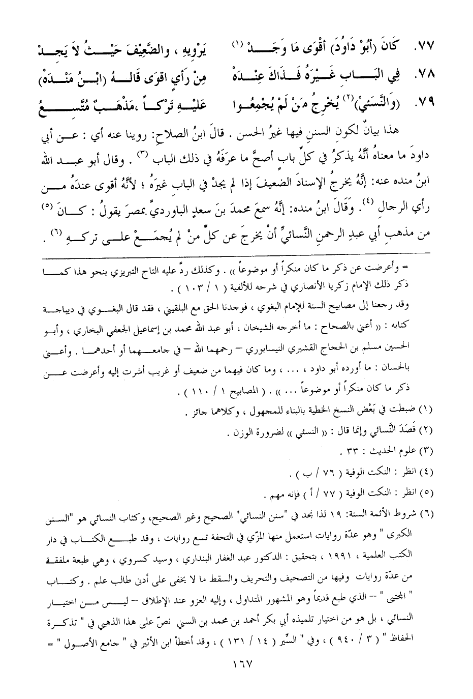 هذا بيانٌ لكونِ السننِ فيها غيرُ الحسن. قالَ ابنُ الصلاحِ: روينا عنه أي: عن أبي داودَ ما معناهُ أنَّهُ يذكرُ في كلِّ بابٍ أصحَّ ما عرَفَهُ في ذلك الباب. وقال أبو عبد الله ابنُ منده عنه: إنَّهُ يخرجُ الإسنادَ الضعيفَ إذا لم يجدْ في البابِ غيرَهُ؛ لأنَّهُ أقوى عندَهُ من رأي الرجالِ. وَقَالَ ابنُ منده: إنَّهُ سمعَ محمدَ بنَ سعدٍ الباورديَّ بمصرَ يقولُ: كانَ من مذهبِ أبي عبدِ الرحمنِ النَّسائيِّ أنْ يخرجَ عن كلِّ منْ لم يُجمَعْ على تركهِ.