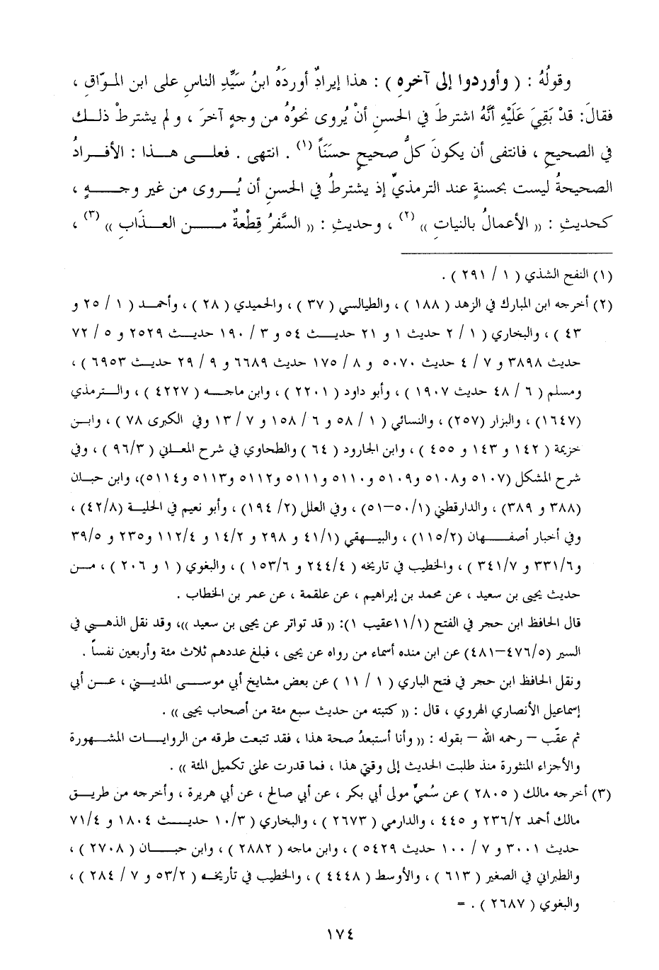 وقولُهُ: (وأوردوا إلى آخرهِ) : هذا إيرادٌ أوردَهُ ابنُ سَيِّدِ الناسِ على ابن الموّاقِ، فقالَ: قدْ بَقِيَ عَلَيْهِ أنَّهُ اشترطَ في الحسنِ أنْ يُروى نحوُهُ من وجهٍ آخرَ، ولم يشترطْ ذلك في الصحيحِ، فانتفى أن يكونَ كلُّ صحيحٍ حسَنَاً. انتهى. فعلى هذا: الأفرادُ الصحيحةُ ليست بحسنةٍ عند الترمذيِّ إذ يشترطُ في الحسنِ أن يُروى من غير وجهٍ، كحديثِ: ((الأعمالُ بالنياتِ)) ، وحديثِ: ((السَّفرُ قِطْعةٌ من العذَابِ)) ،
