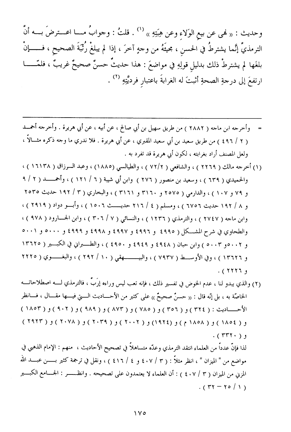 وحديث: ((نهى عن بيعِ الوَلاءِ وعن هِبَتِهِ)) . قلتُ: وجوابُ ما اعترضَ به أنَّ الترمذيَّ إنَّما يشترطُ في الحسنِ، مجيئَهُ من وجهٍ آخرَ، إذا لم يبلغْ رُتْبَةَ الصحيحِ، فإنْ بلغَها لم يشترطْ ذلك بدليلِ قولِهِ في مواضعَ: هذا حديثٌ حسنٌ صحيحٌ غريبٌ، فلمّا ارتفعَ إلى درجةِ الصحةِ أثبتَ له الغرابةَ باعتبارِ فرديَّتِهِ.
